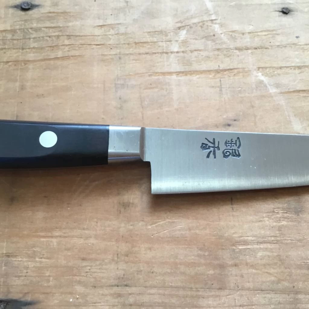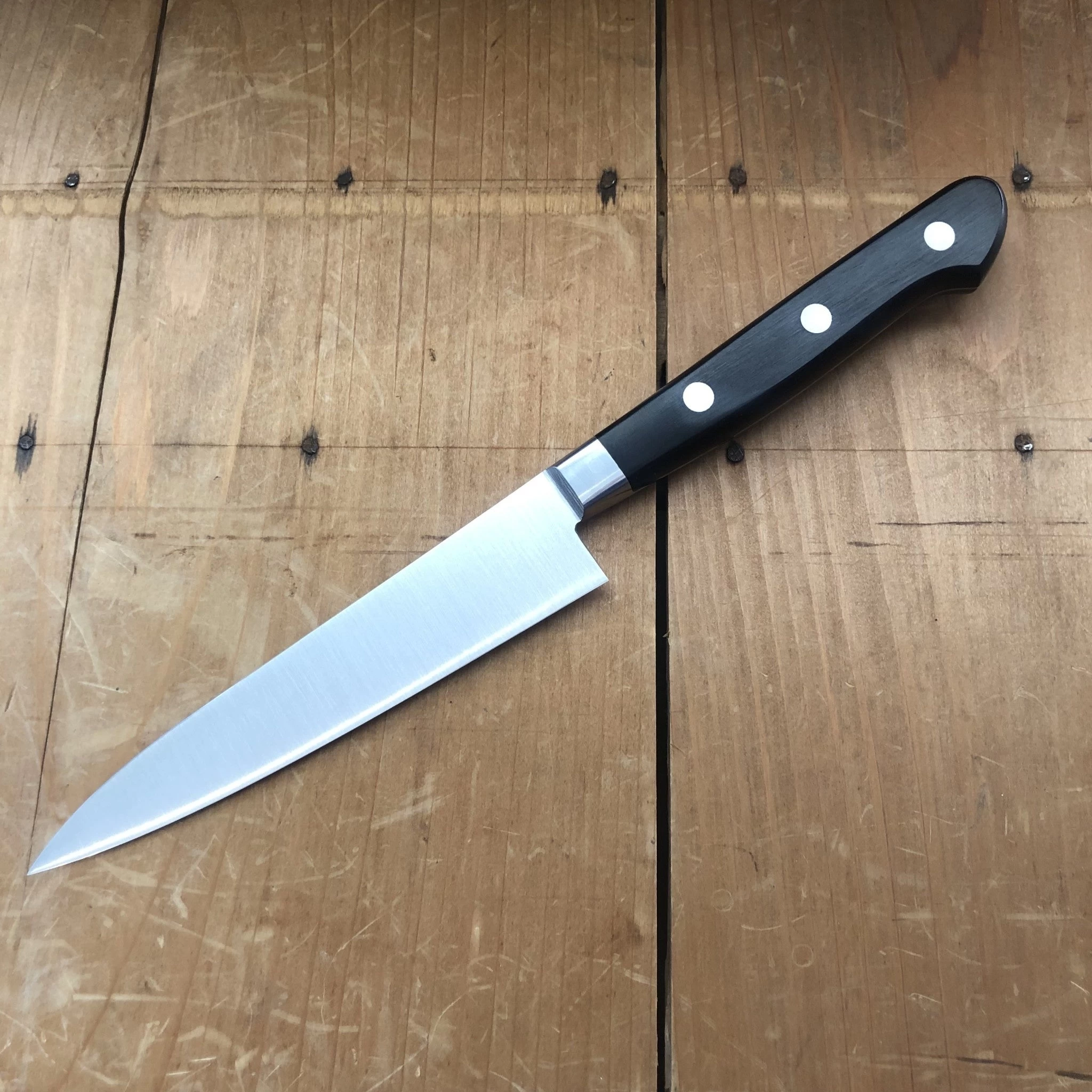 Ashi Hamono 120mm petty knife with Swedish stainless steel blade and western style riveted pakka wood handle. Saya cover is included.