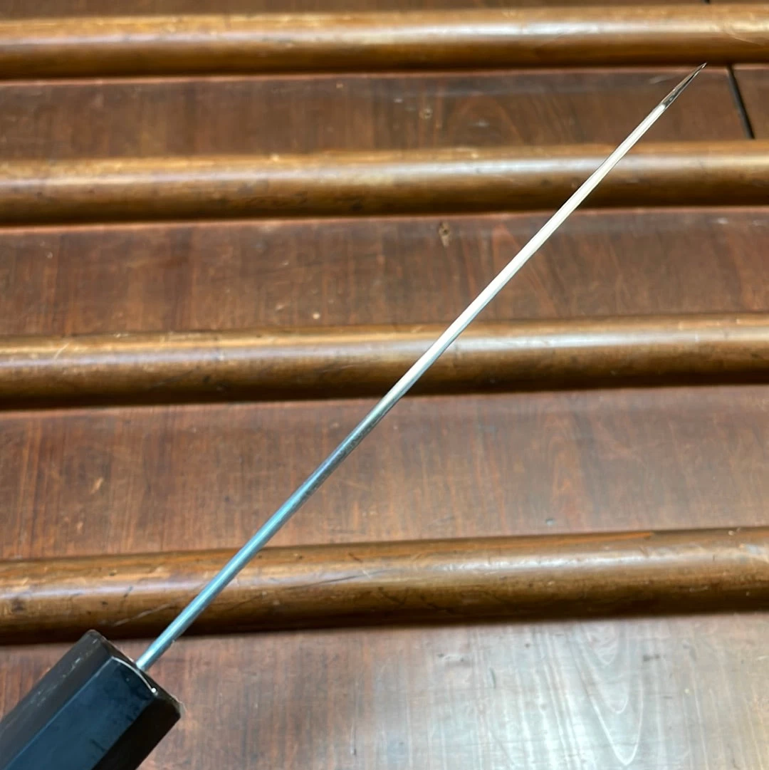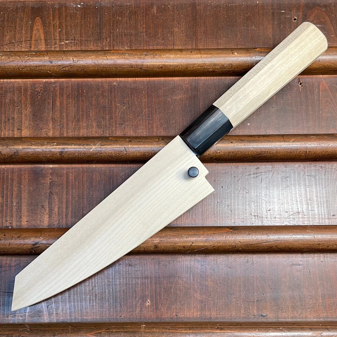 Ashi Hamono 150mm honesuki kaku with Shirogami #2 carbon steel blade. Octagon magnolia wood handle and water buffalo horn ferrule. Right Handed. Saya cover is included.