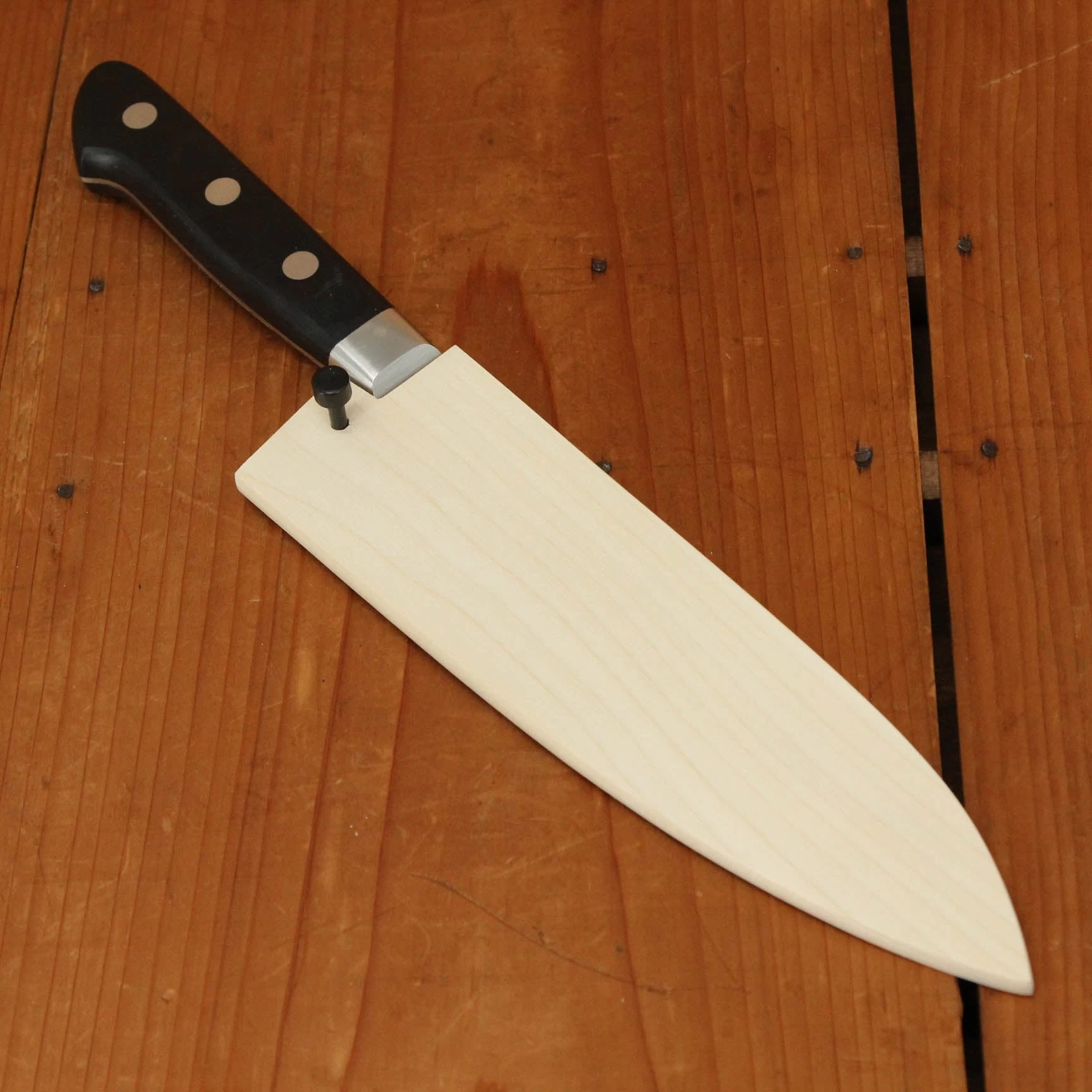 Ashi Hamono 165mm santoku knife with Swedish stainless steel blade and western style riveted pakka wood handle. Saya cover is included. HRC 59. 145 grams, 172mm cutting edge, 293mm approx. overall, 44mm height at heel