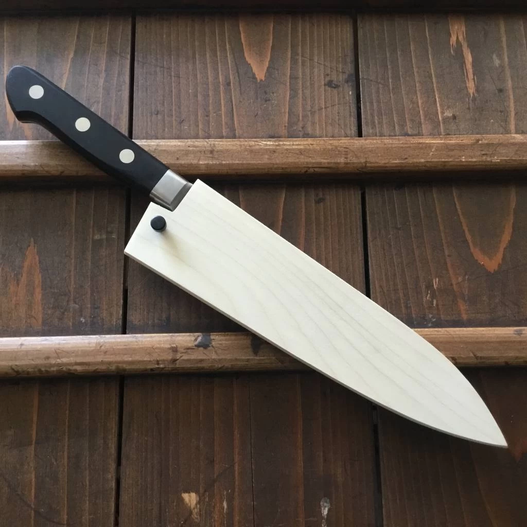 Ashi Hamono 180mm santoku knife with Swedish stainless steel blade and western style riveted pakka wood handle. Saya cover is included.