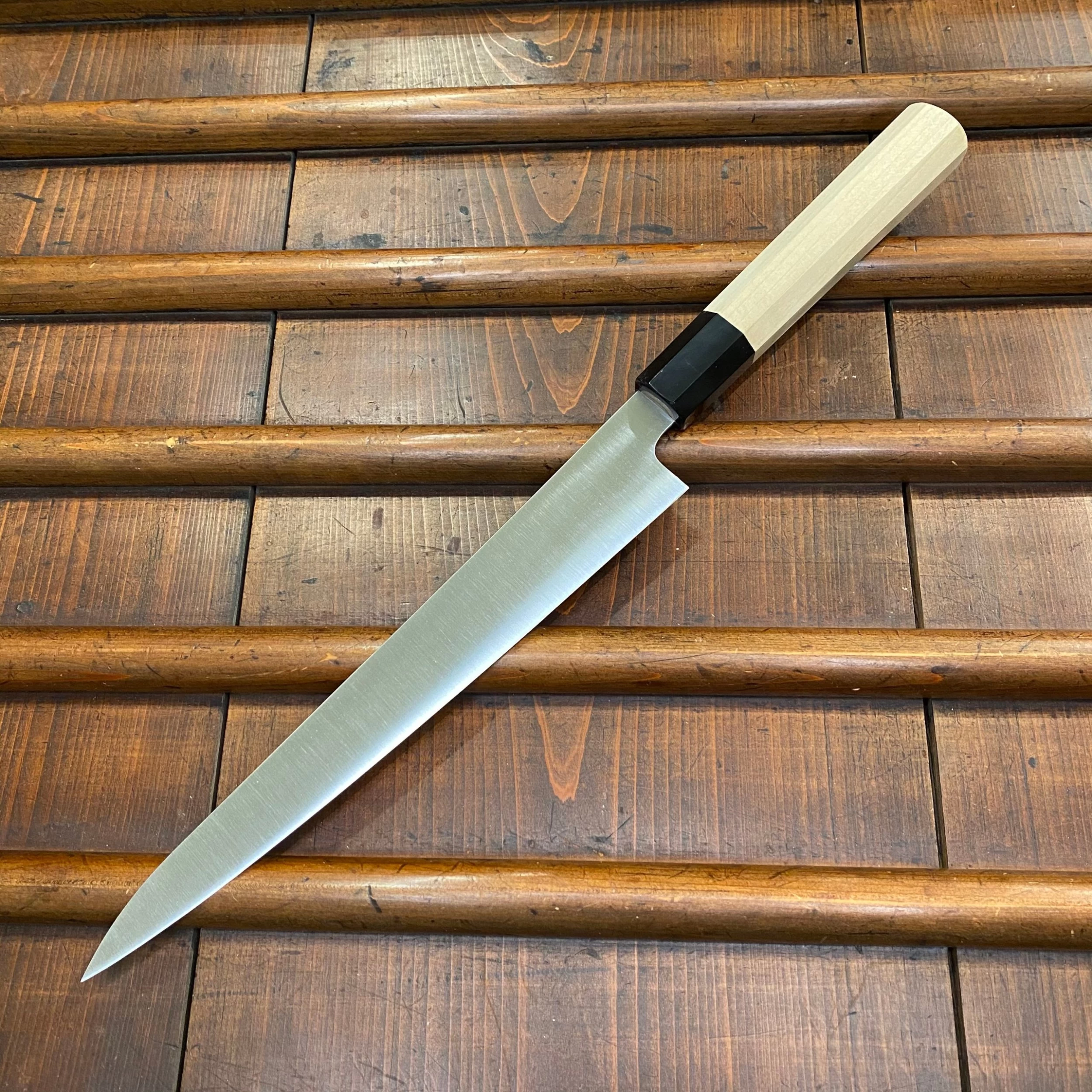 Ashi Hamono 240mm sujihiki slicing knife with Swedish stainless steel blade. Octagon magnolia wood handle and water buffalo horn ferrule. Saya cover is included.
