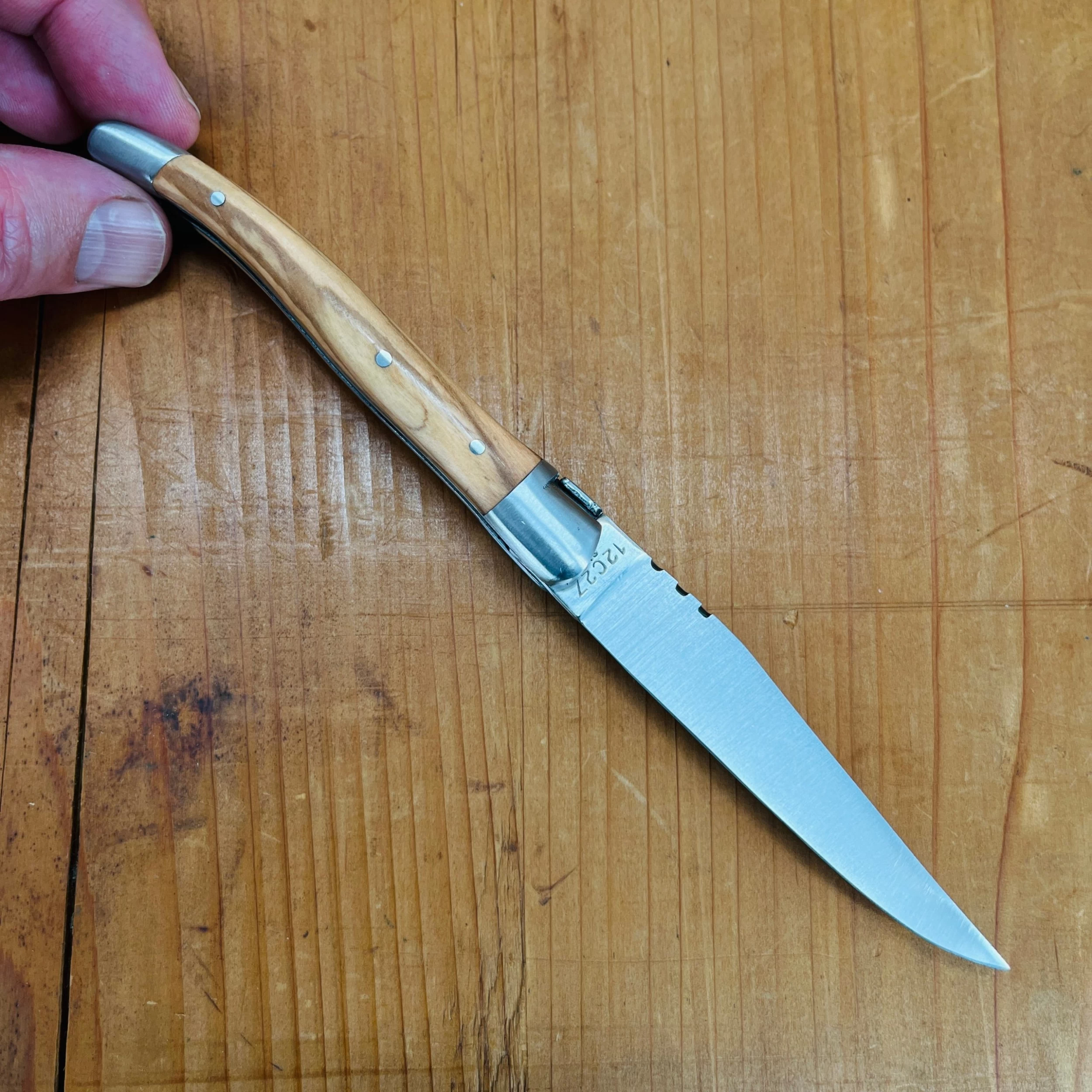 10 cm Laguiole pattern knife from Massif Central region, made in Thiers France for Au Sabot with stainless steel blade, two stainless bolsters and olive handle scales.