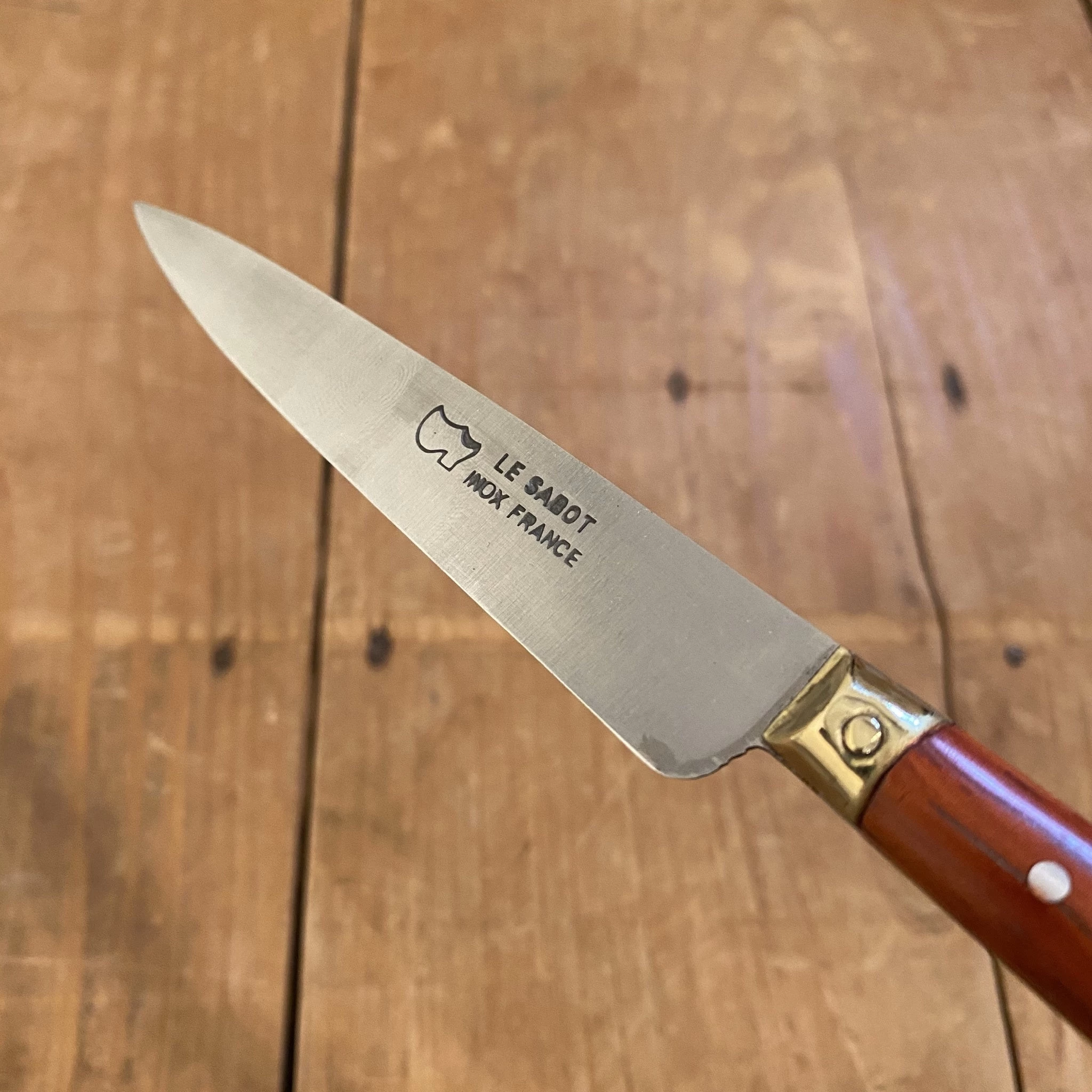 Au Sabot 4″ stainless pointed paring knife with brass bolster and Cam wood handle. Cam wood is harvested in West Africa and has variety of uses including as a durable and beautiful wood for cutlery. It’s conservation status is of “least concern” according to CITES treaty.