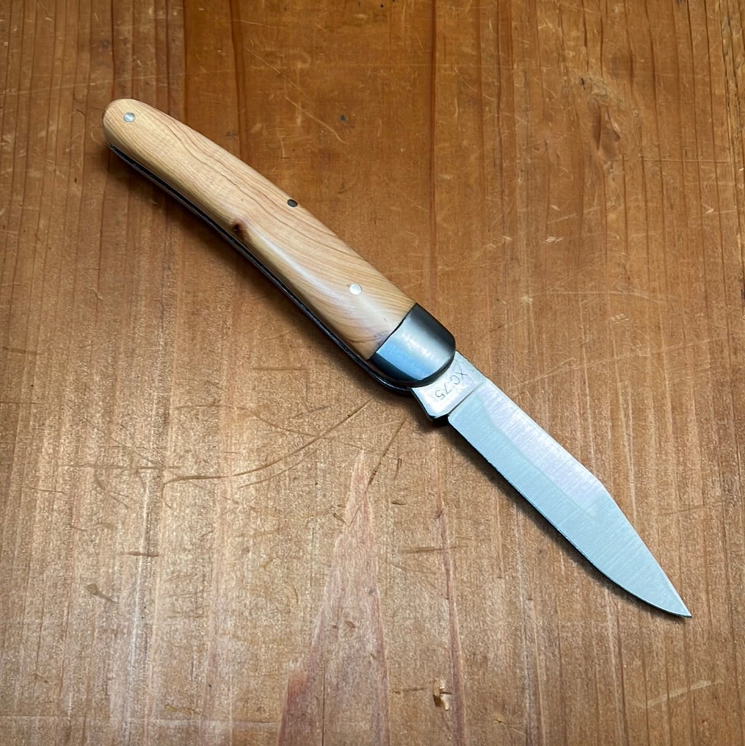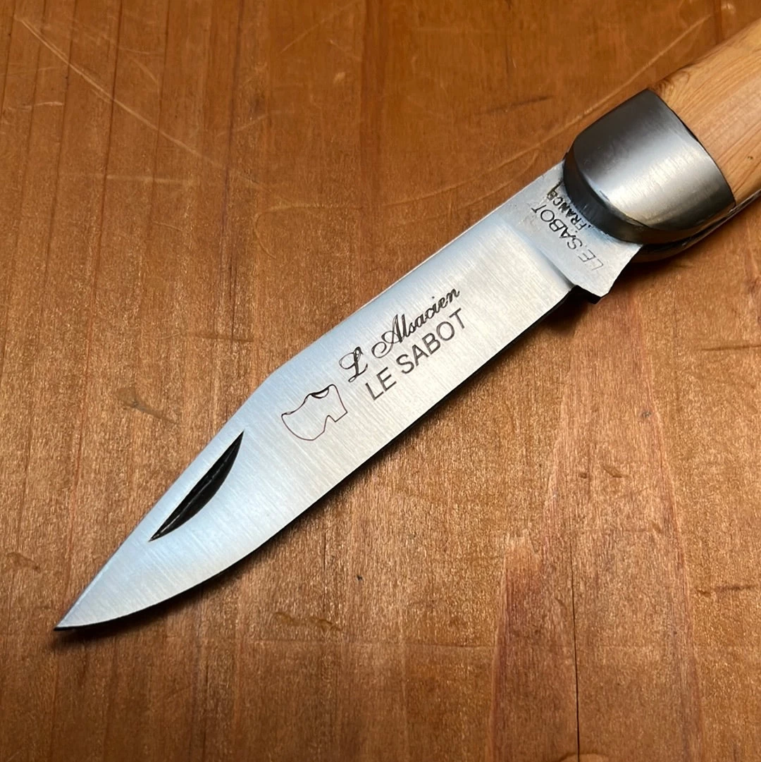 10cm Alsacien pattern knife from the Alsace region in north east France. Made in Thiers France for Au Sabot with carbon steel blade and bolster with juniper handle scales.