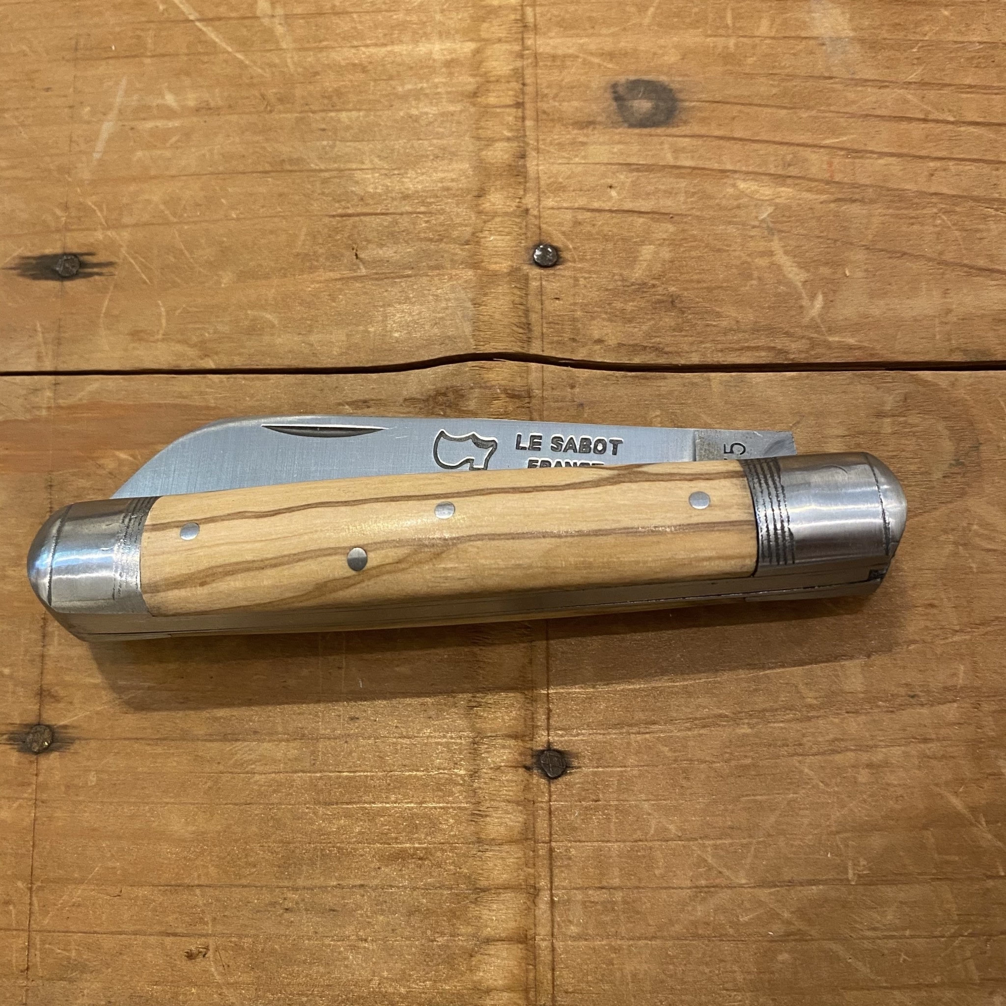 9cm Tonneau pattern knife from central France, made in Thiers France for Au Sabot with carbon steel blade double bolsters and olive handle scales.