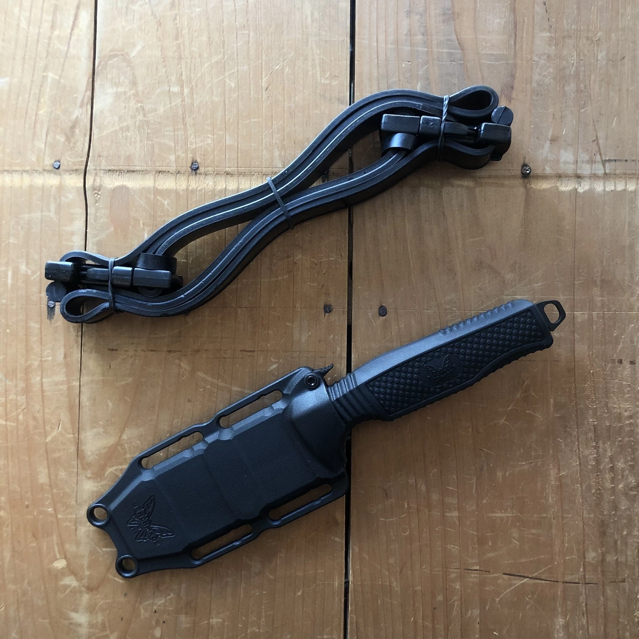 Benchmade 112SBK-BLK H20 fixed blade diving knife. N680 ultra stainless steel black coated blade with rubber handle and plastic molded sheath. Partially serrated blade with blunt tip and rescue hook.