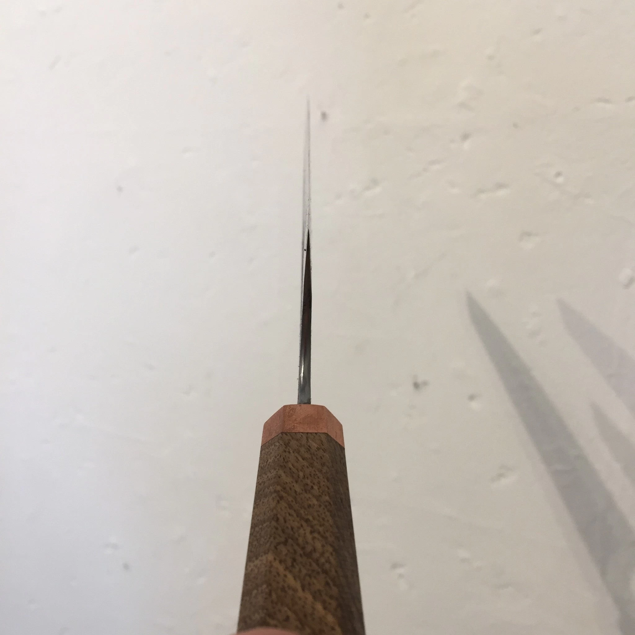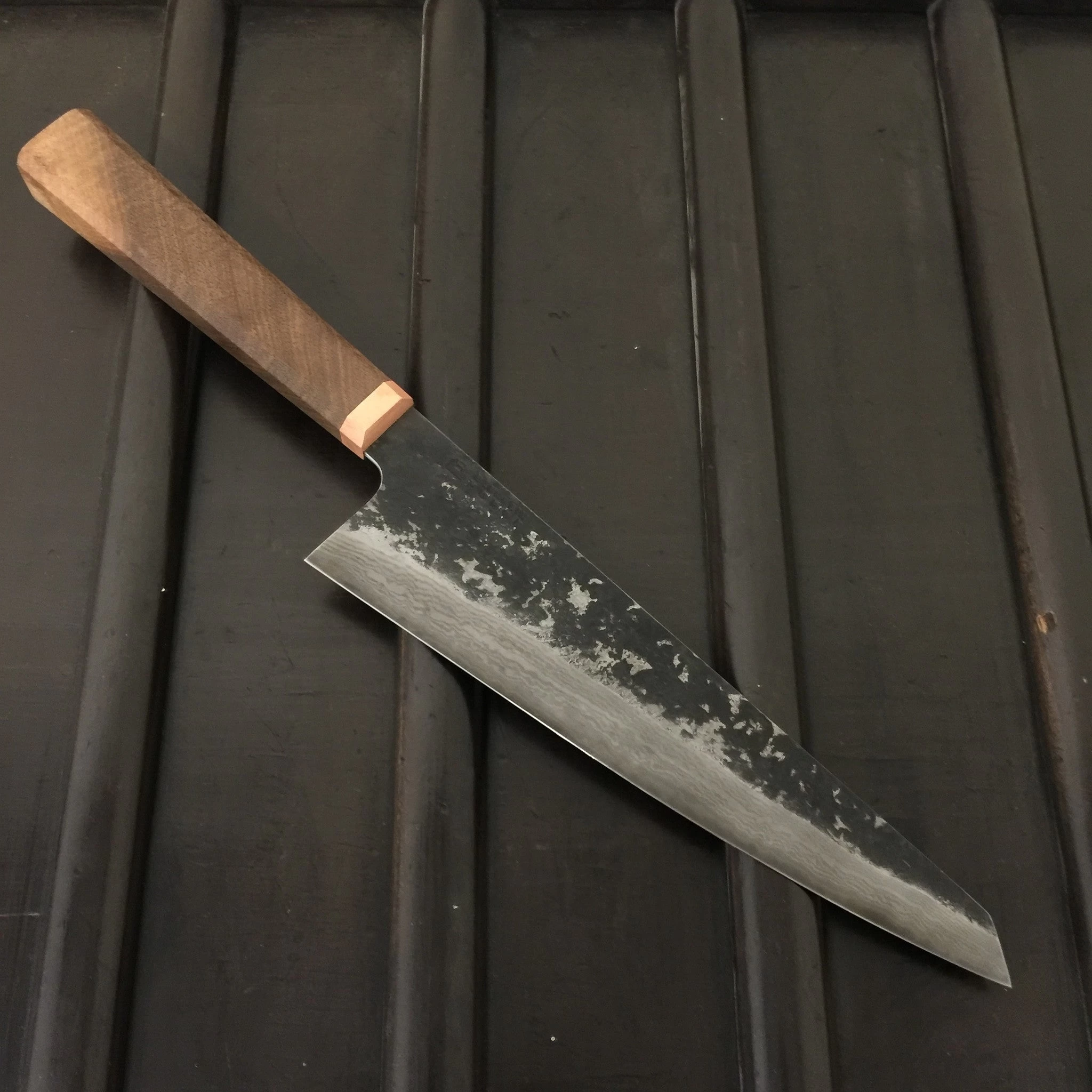 Forged, ground and handles made by hand at the Blenheim Forge works in Peckham South London. Blenheim Forge knives are made with Japanese aogami super tungsten carbon steel and English woods and handle materials.