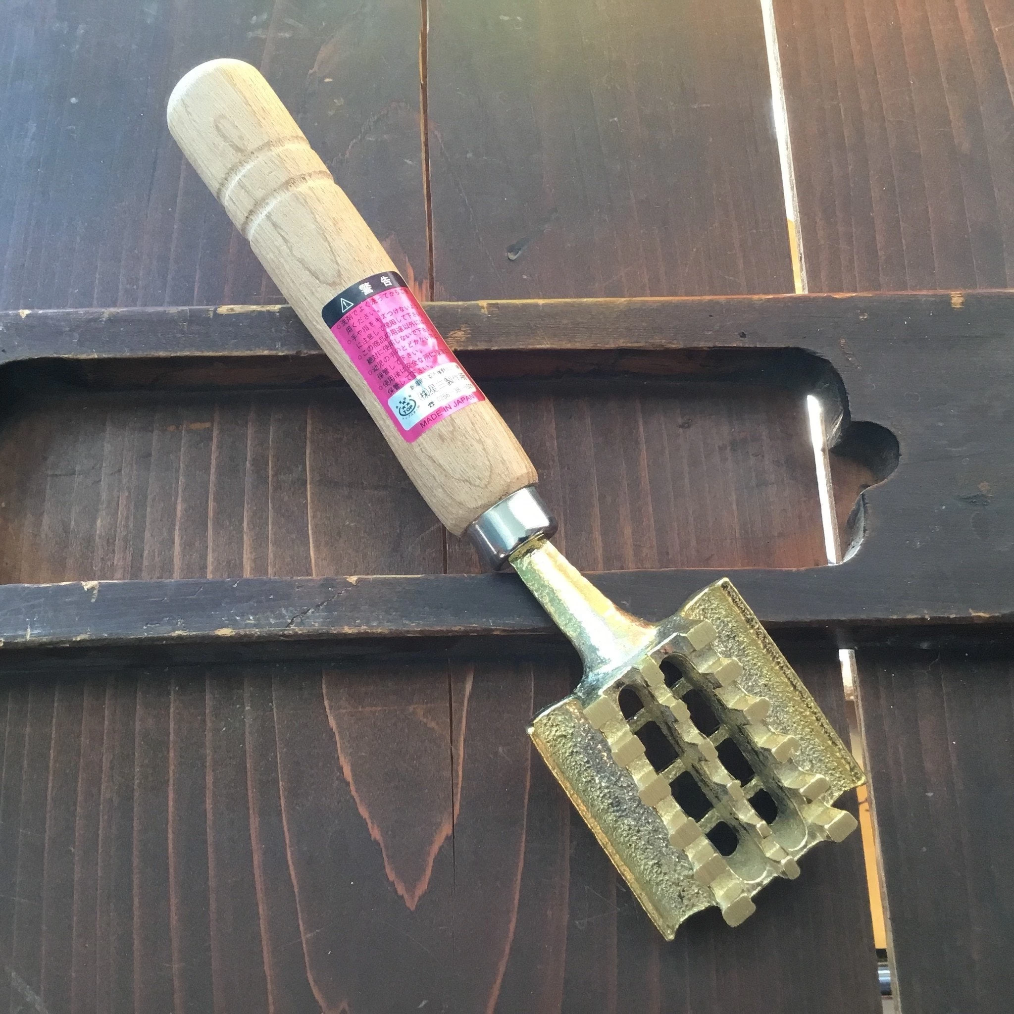 Large fish scaler with brass teeth with a solid oak handle. Great for scaling large fish quickly. Winged option to help control scales and debris.