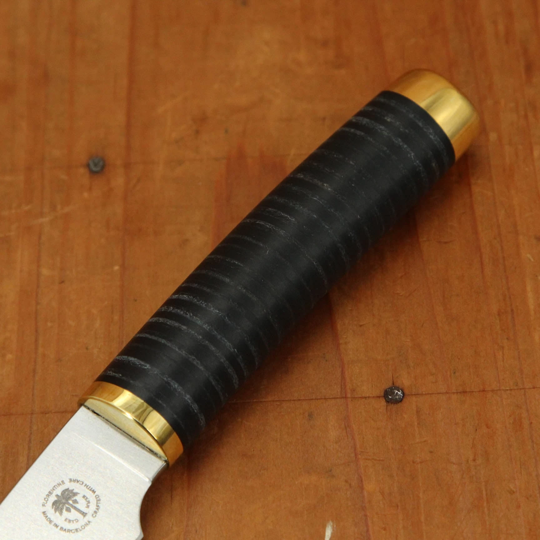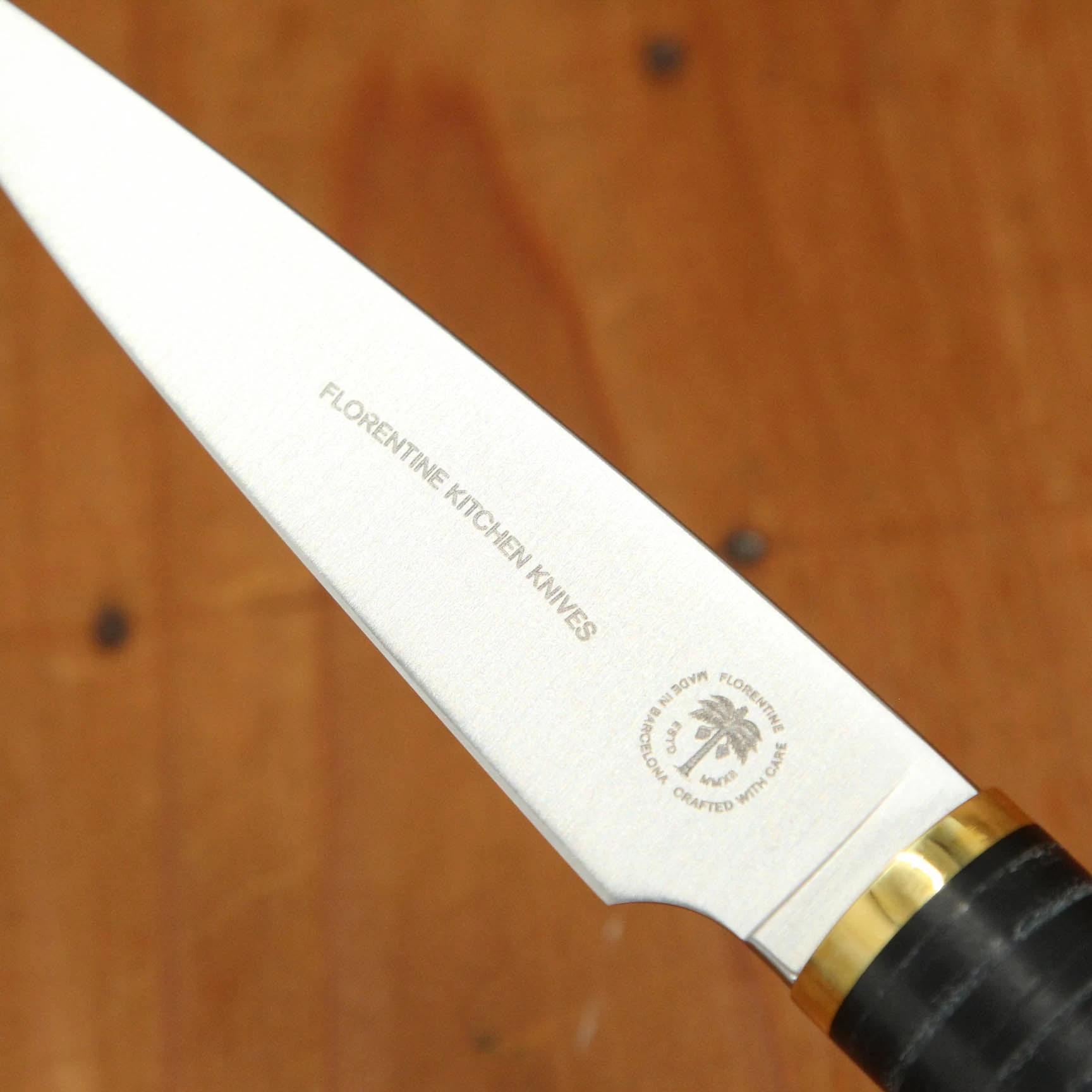 A European style paring knife deigned by Florentine Kitchen Knives to be used for handheld work and small tip work on a cutting board. Made with European Carbon Steel and stacked micarta and leather handle with brass pommel and ferrule. XC75 is a low alloy carbon steel valued for its ease of sharpening and edge retention. It has no corrosion resistance and will oxidize with use and corrode with neglect. do not let sit wet or dirty. Hand wash and towel dry.
