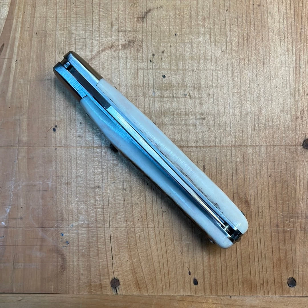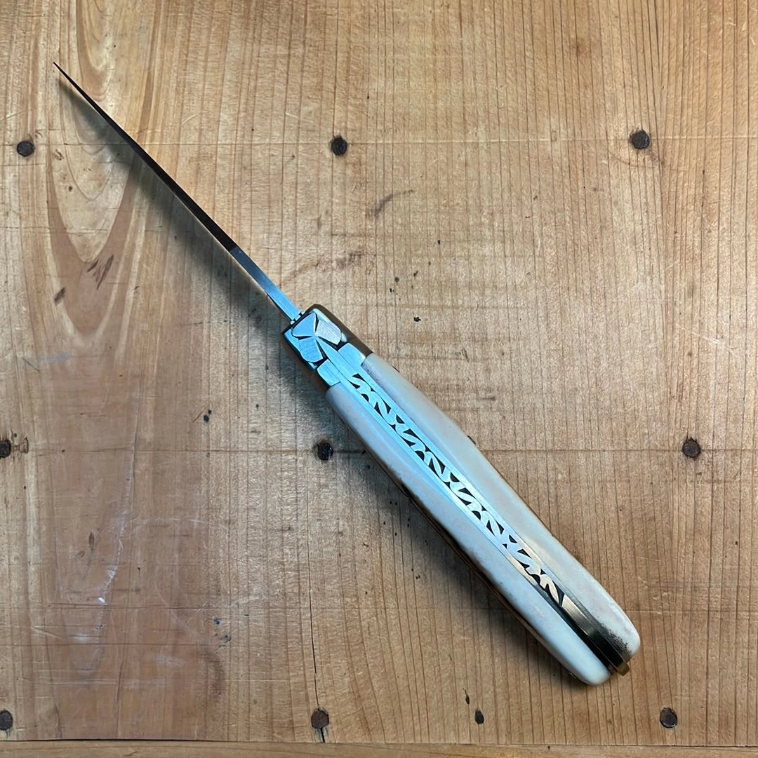 The Laguiole knife has a distinctive design influenced by the Spanish Navaja. A smaller, more tactile version was made for the sheep-herders on the Aubrac plateau in France, and was named after the town Laguiole. In addition to the iconic ‘bee’ or ‘fly’ on the spring, typically they feature a semi yataghan shaped blade, a slip joint mechanism with a slim tapered handle made from natural material, traditionally cow horn.