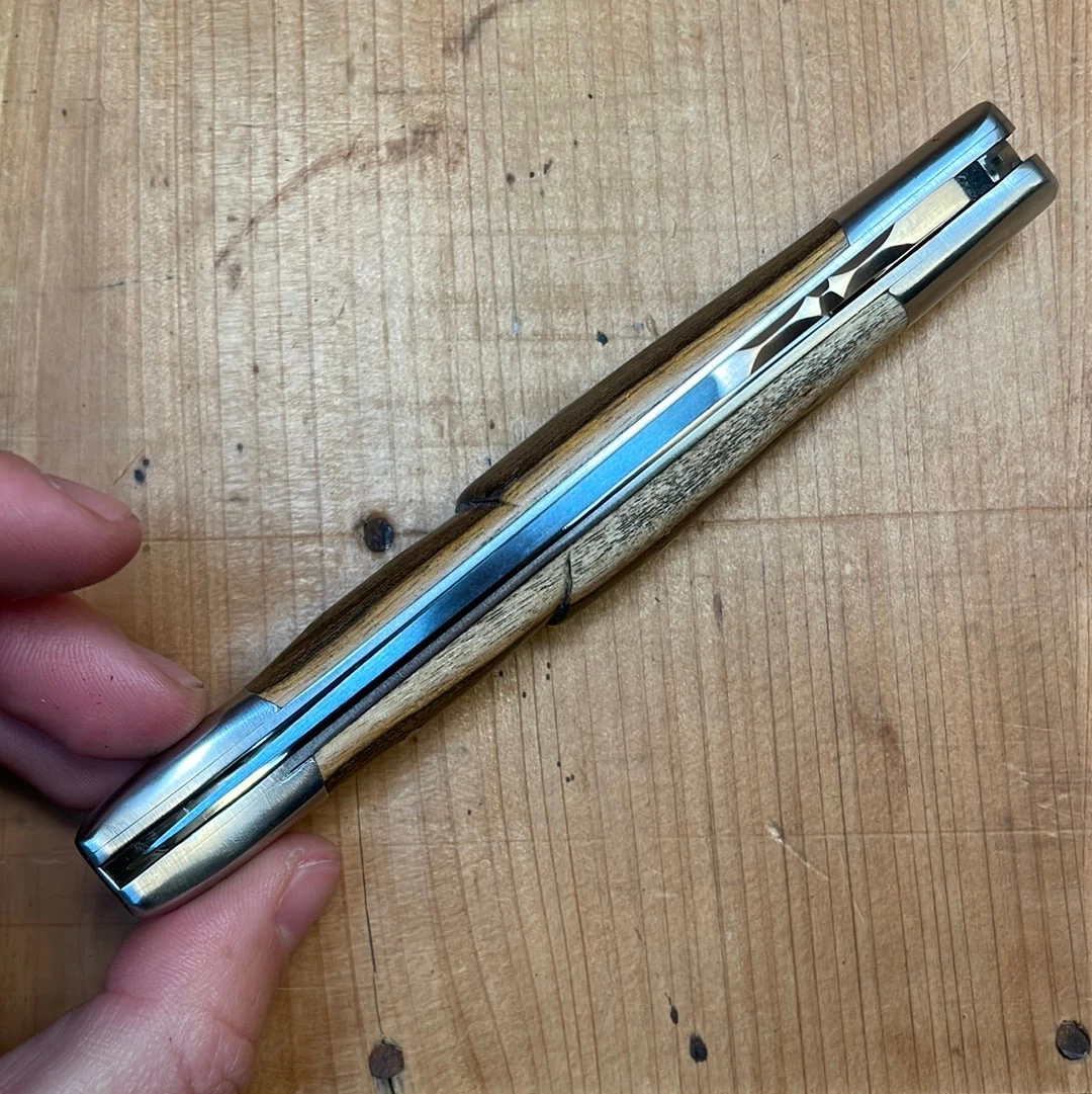 Hand made in France by Fontenille Pataud with a stainless blade, stainless bolsters and corkscrew, and hand filed spring (no lock on this one) at the butt of handle which is hafted in pistachio wood.