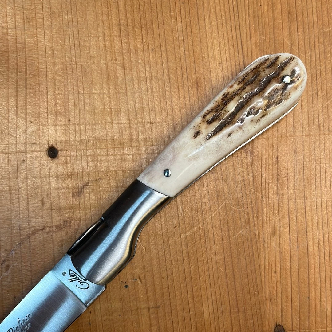 Hand made in France by Fontenille Pataud stainless blade, stainless bolsters and hand filed spring and locking release at the butt of handle which is hafted in stag.
