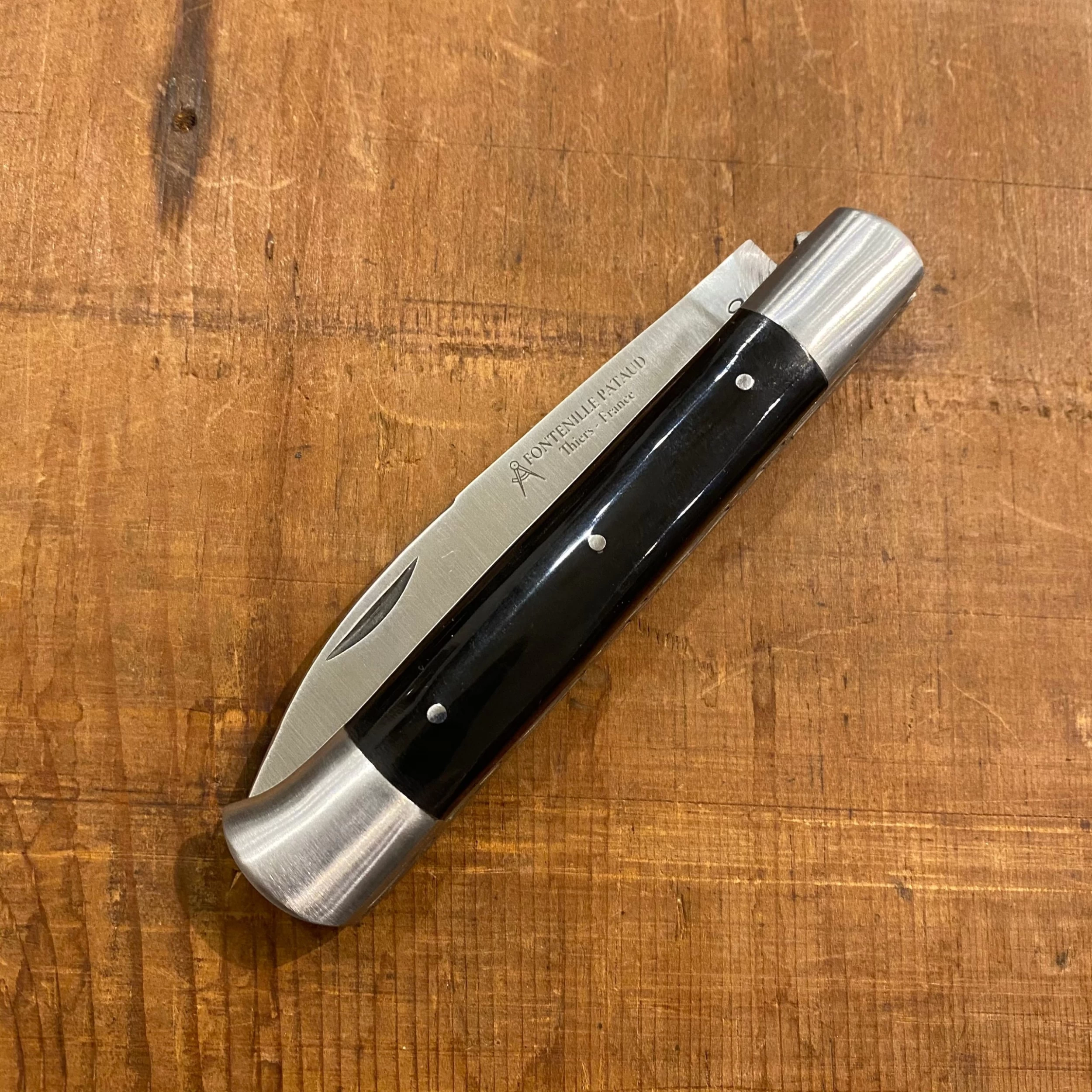 Hand made in France by Fontenille Pataud stainless blade, double stainless bolsters and hand filed spring, handle is hafted in water buffalo horn.