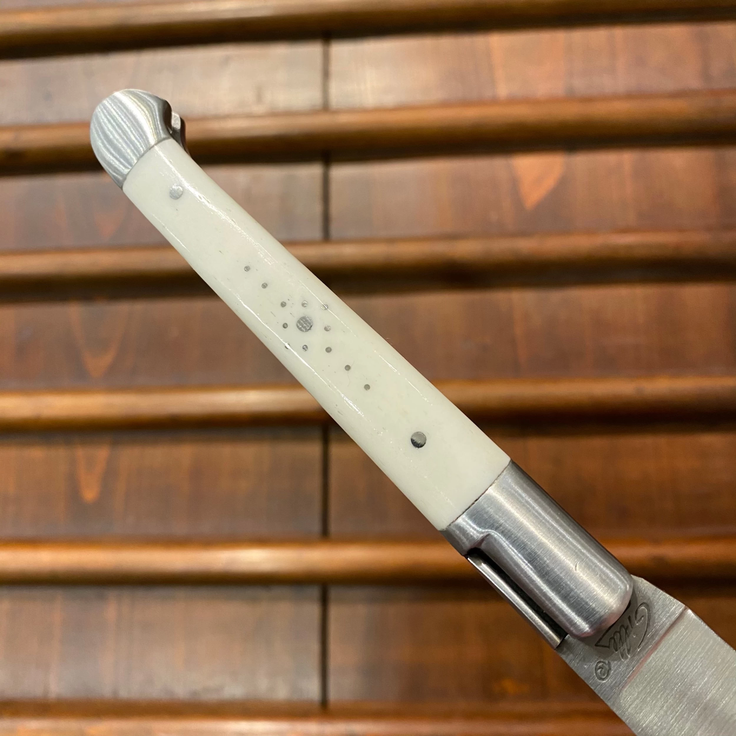 The Saint Martin style pocket knife is sleek and slim. The blade has a flat profile, and the handle is decorated with stainless rivets.