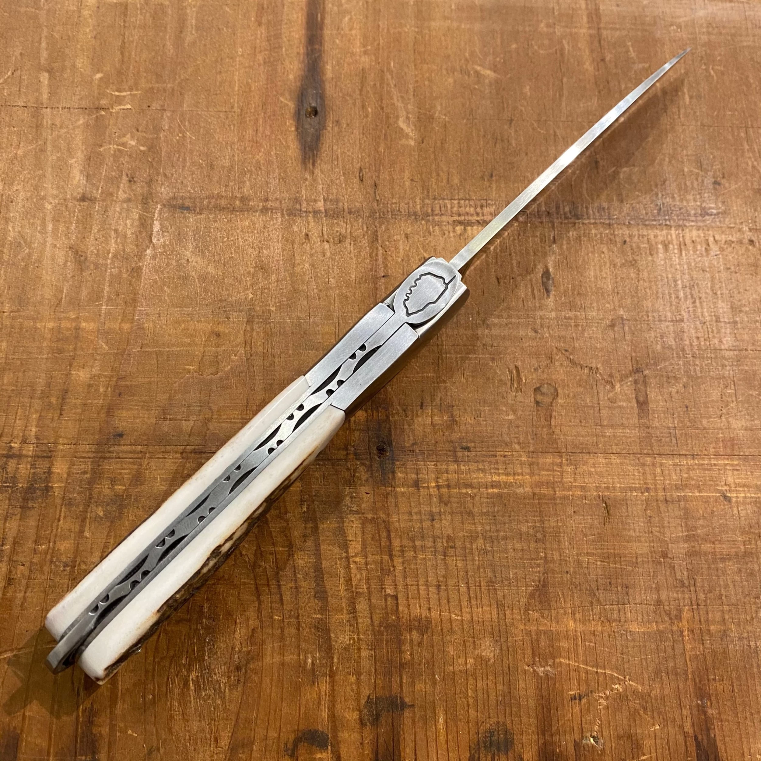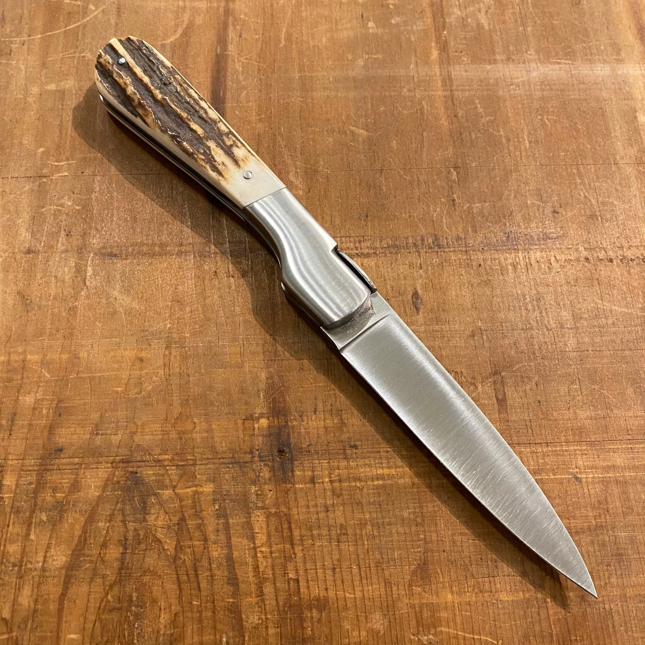 Hand made in France by Fontenille Pataud stainless blade, stainless bolsters and hand filed spring and locking release at the butt of handle which is hafted in stag.
