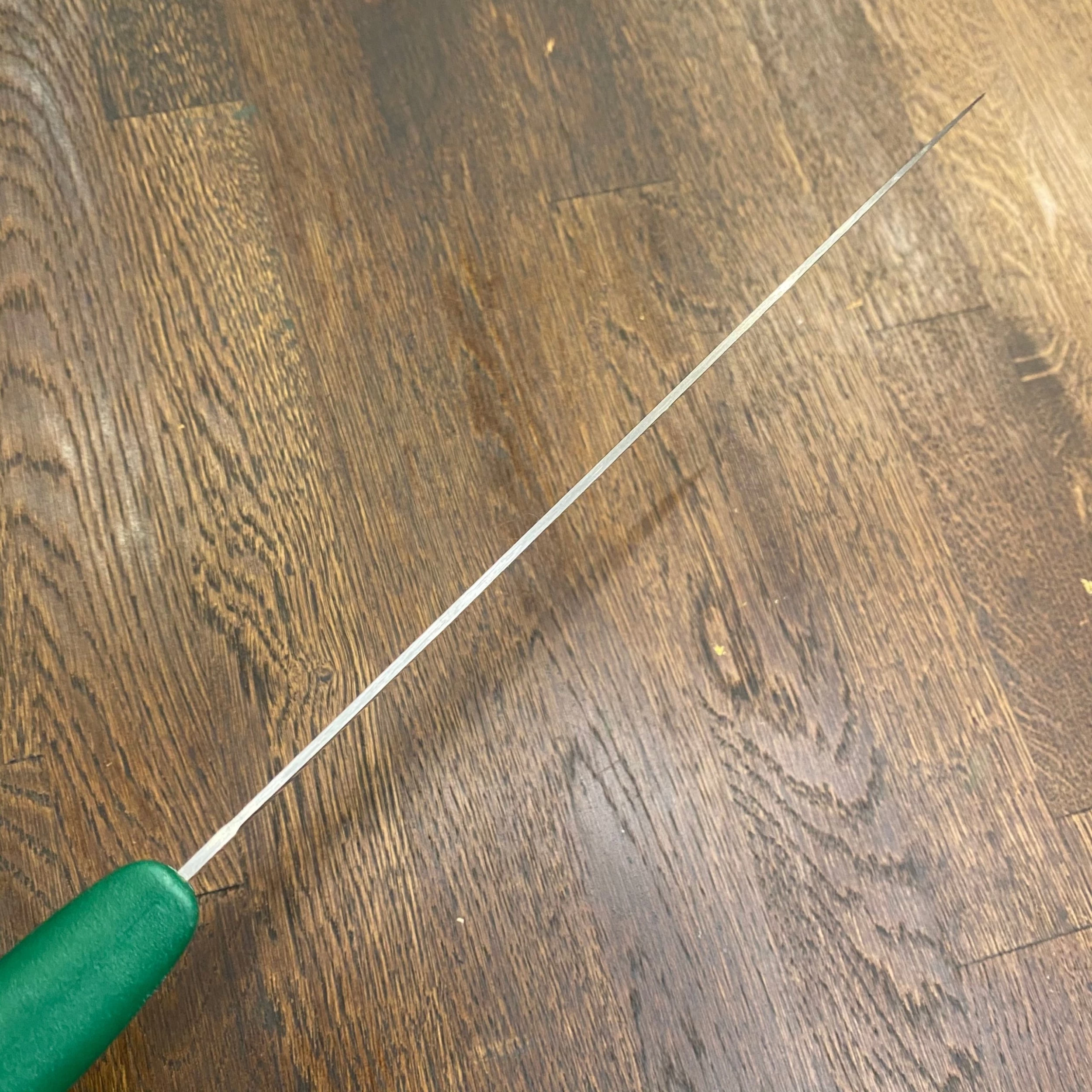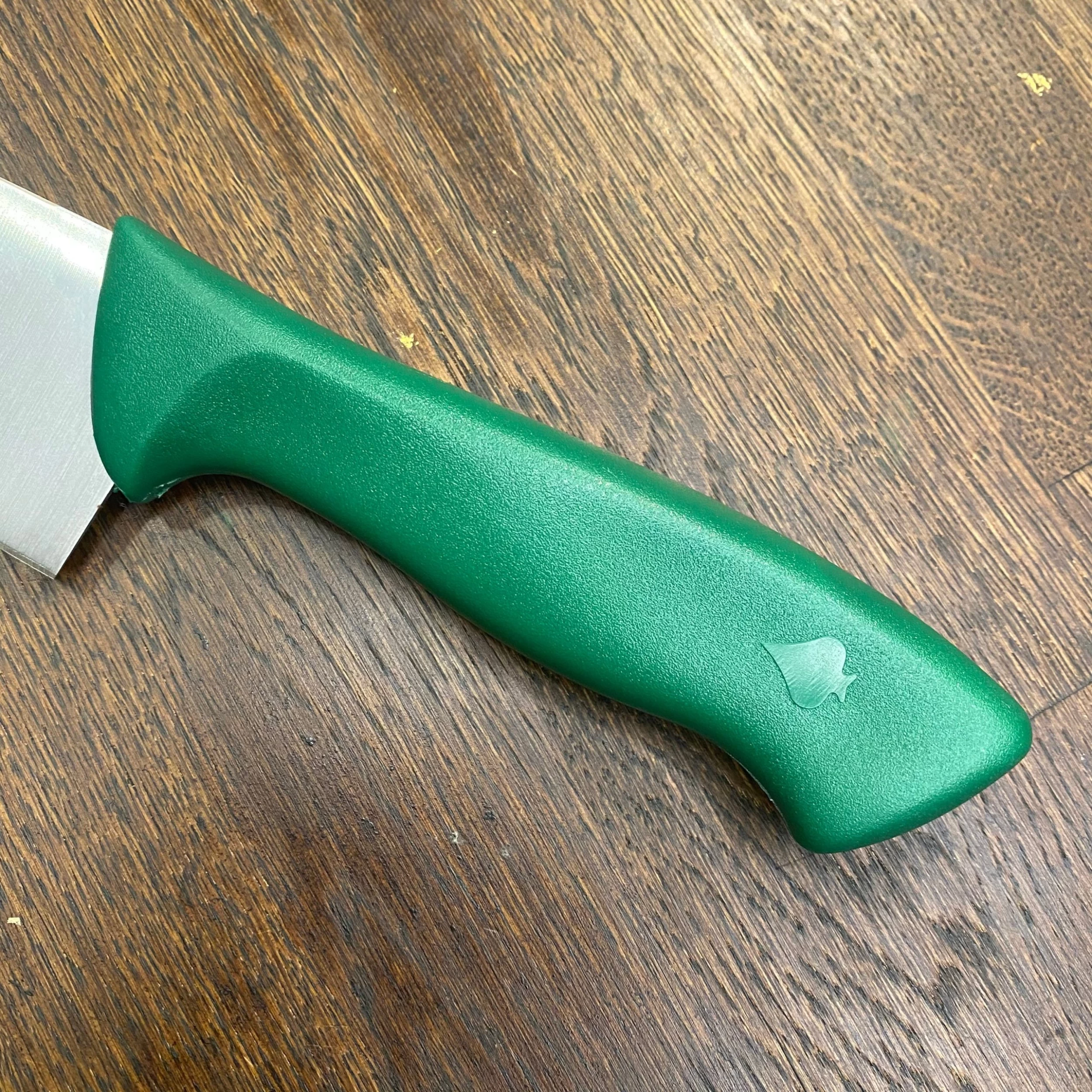 10.25″ stainless steel chef’s knife with green plastic ergonomic handle from the Pikas-Don Carlos line.