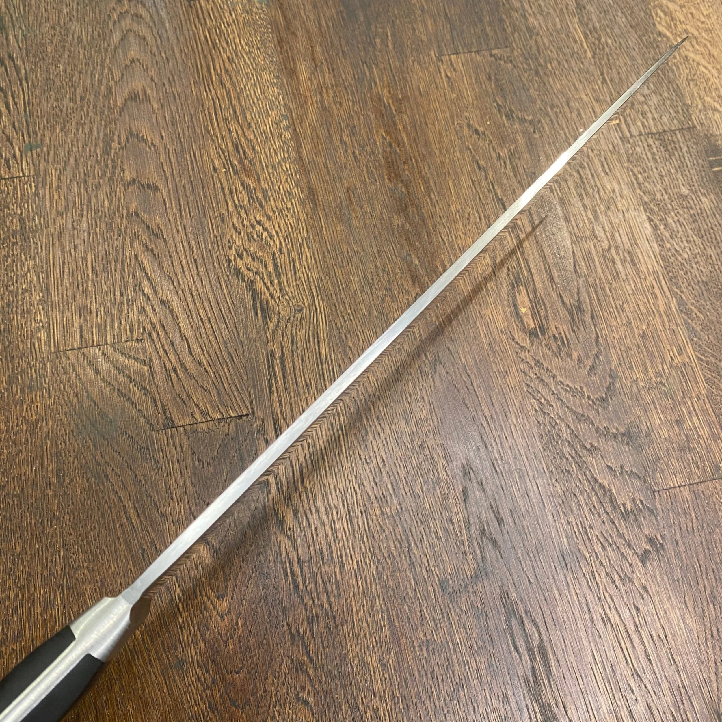 12″ drop forged stainless steel western chef’s knife with black POM riveted handle withe Pikas Spade insignia.