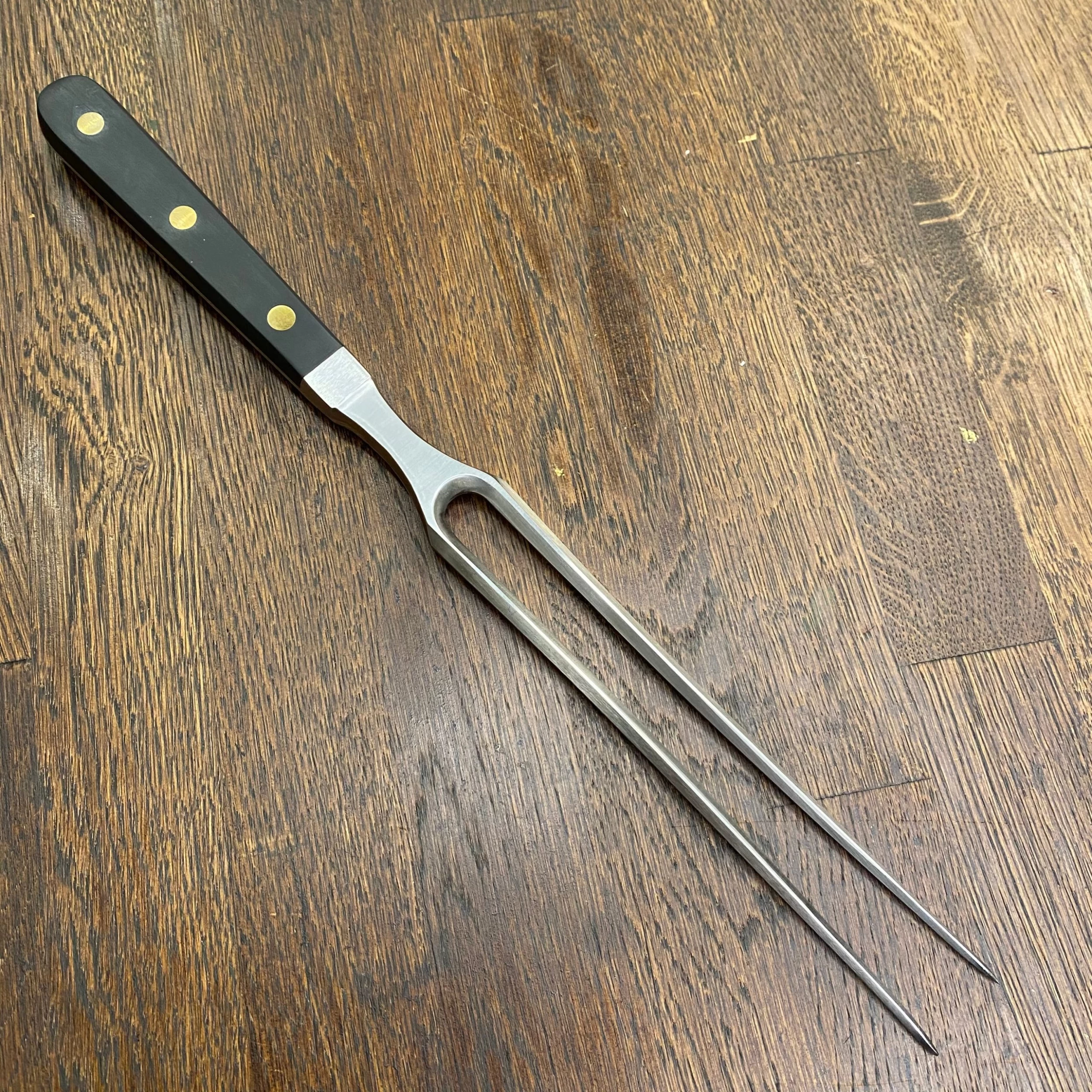 7″ drop forged stainless steel bayonet fork with squared tines and riveted black POM handle with Pikas Spade insignia.