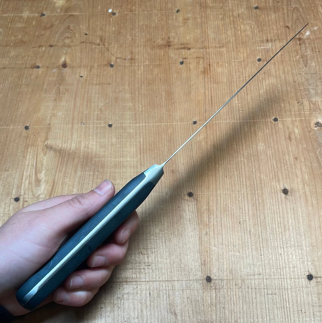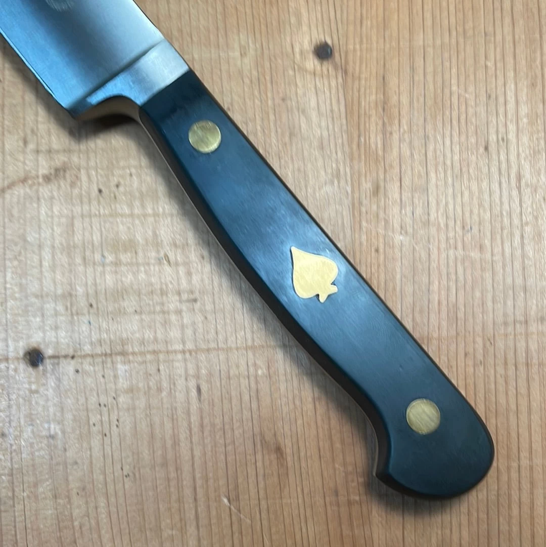7″ drop forged stainless steel flexible slicer with riveted black POM handle with Pikas Spade insignia.