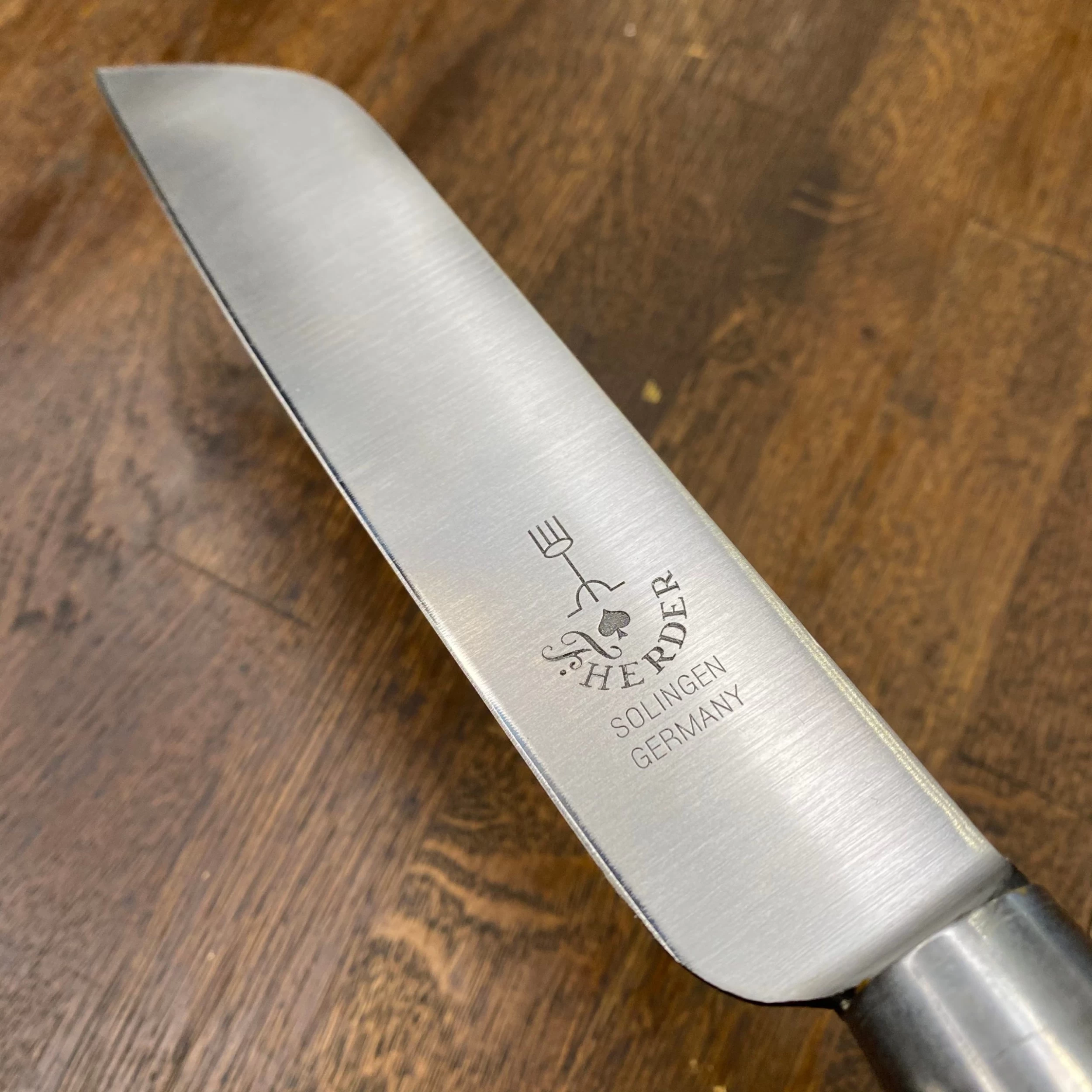Friedr. Herder Abr Sohn company is the longest continually operating knife making operation in Solingen Germany. It’s famous Pikas spade logo was registered in 1727 although their place in Solingen’s blade making traces further back. Friedr Herder has kept many old patterns in carbon steel in production and offers a variety of new production knives for professionals and home cooks. We are happy to include these in our lineup. When looking for old knives seeing that Herder handle with the spade rivet peeking out is always exciting, we think it’s still true of the new production knives as well.