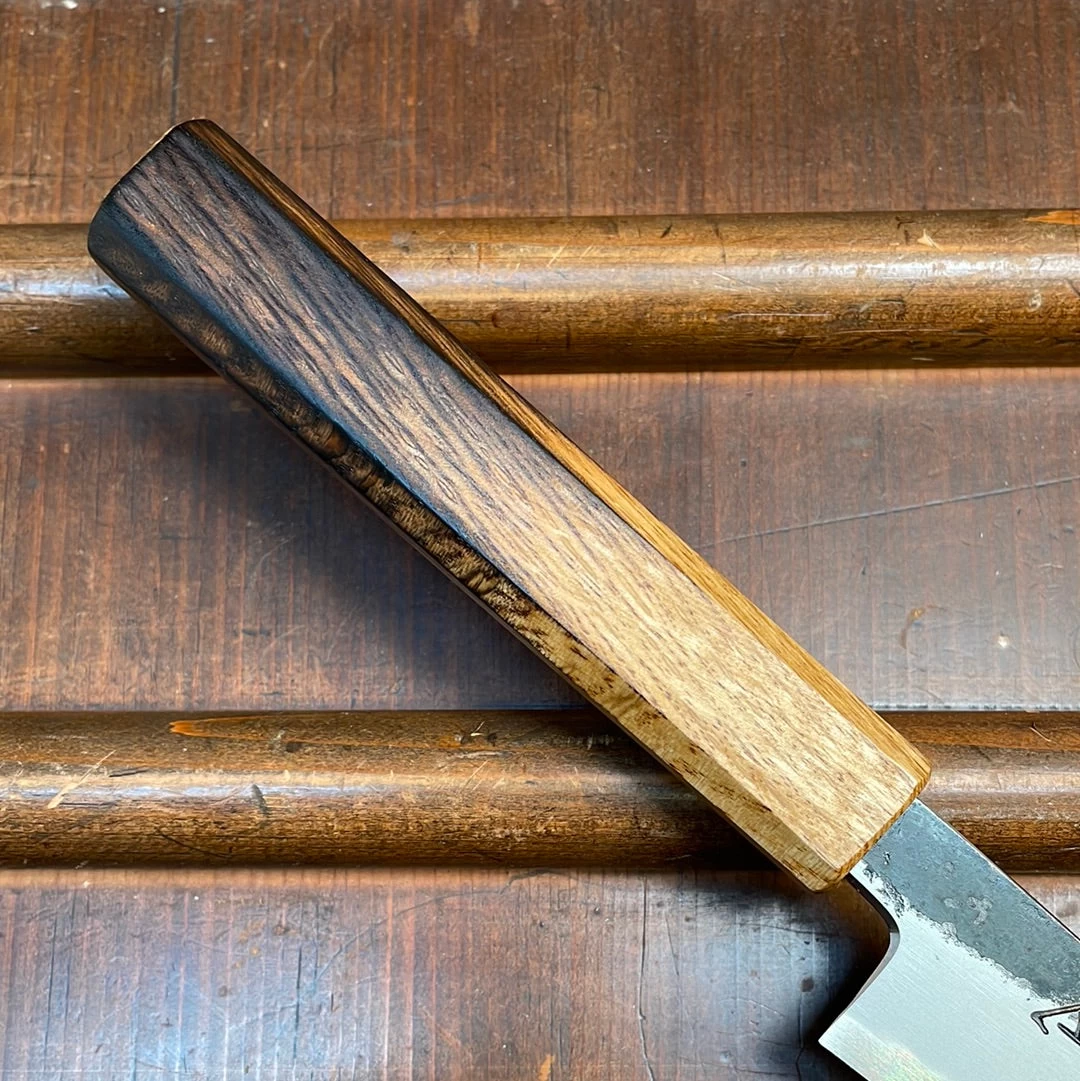Blade is hand forged shirogami #2 with a rustic style kurouchi finished soft iron cladding. Handle is octagonal burnt oak sealed with a thin clear urushi lacquer coating.