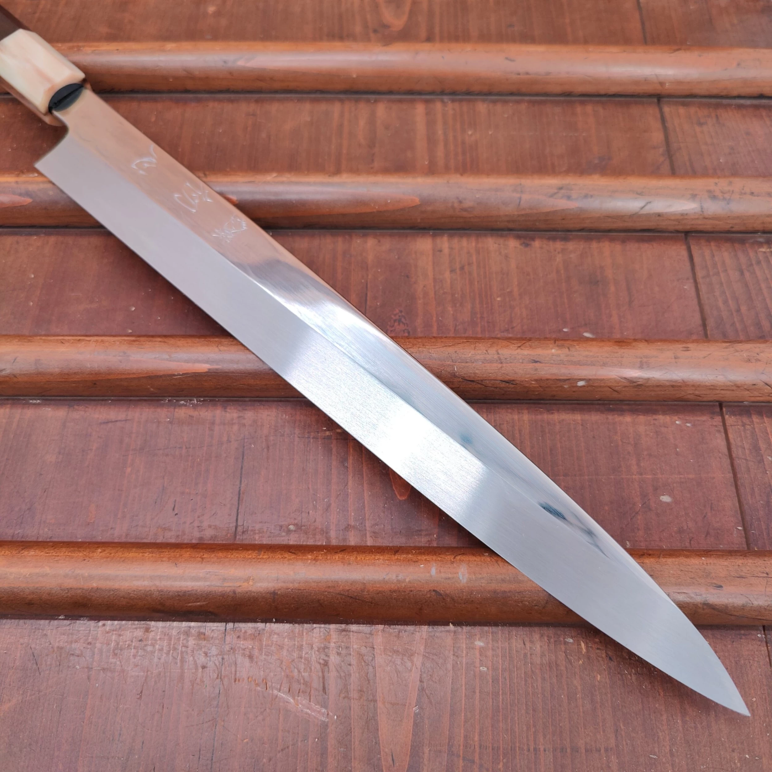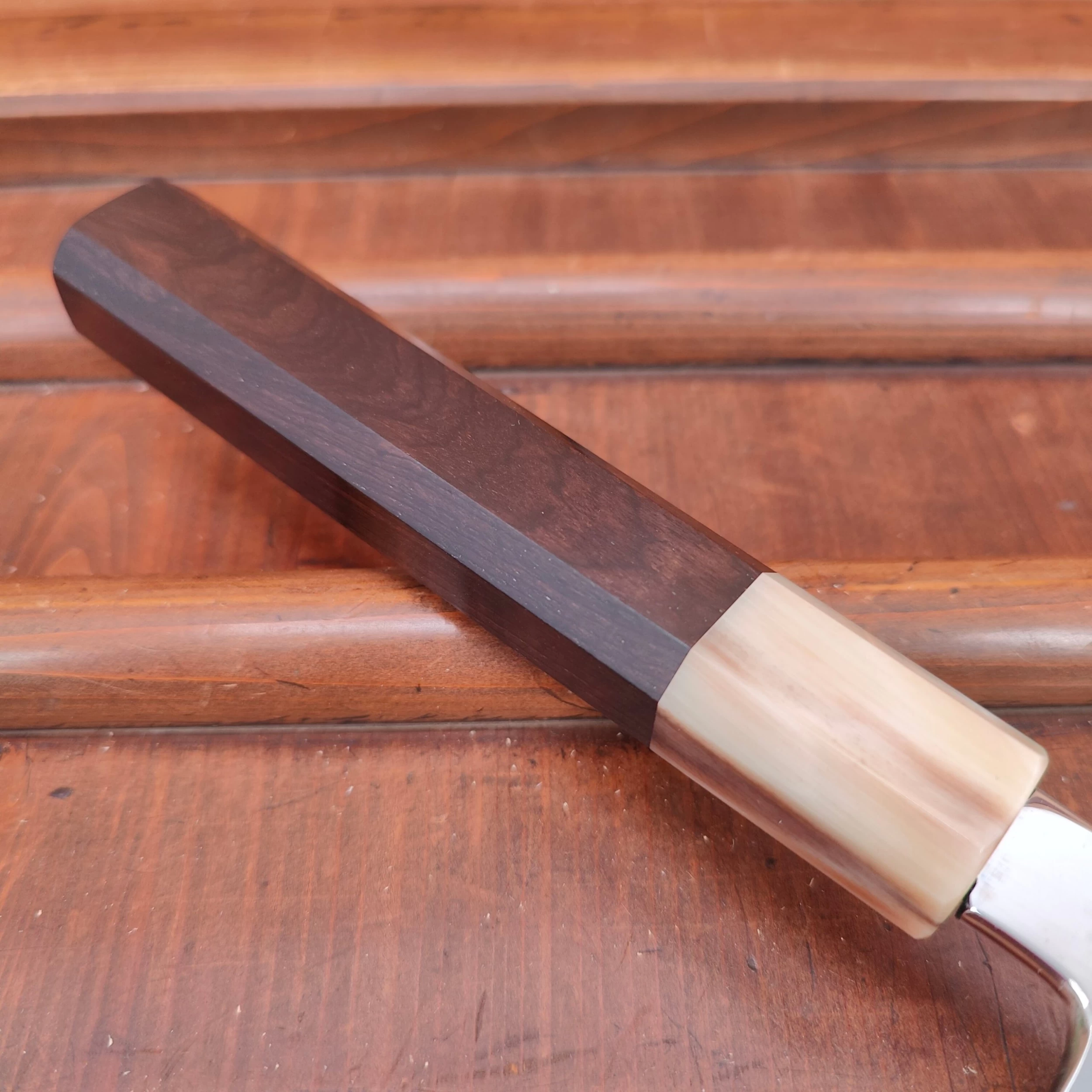 Beautifully hand forged and kyomen mirror finished shirogami 3 carbon steel differentially heat treated oil quench honyaki with horn ferruled ebony handle.