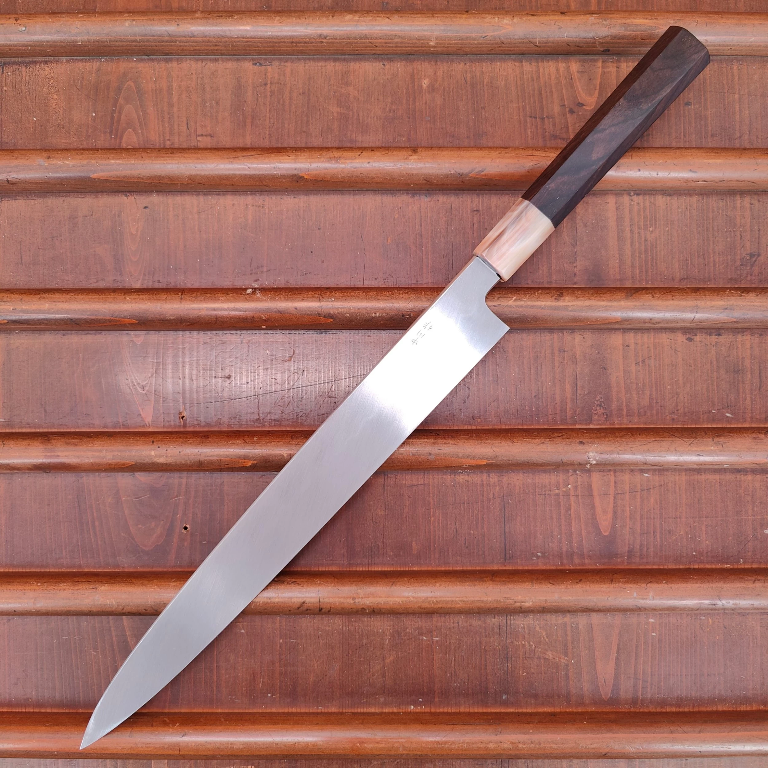 Shirogami 3 is the lowest carbon content of the shirogami group of steels yet is still a very high carbon alloy loved for it’s ability to take an amazing edge. Shiro 3 has the greatest toughness of all shirogami steels which makes it a good choice for a tougher oil quench honyaki. Honyaki heat treatment relies on a single steel blade as opposed to a clad steel / mild steel or iron construction. Honyaki can be more brittle so oil quench shiro 3 will be the toughest of honyaki blades. Oil quench shirogami 3 honyaki will hold an edge much longer than clad shirogami 3 and has the ability to have a very fine but slightly toothy feeling edge at fine finishes. A great steel for those who sharpen.