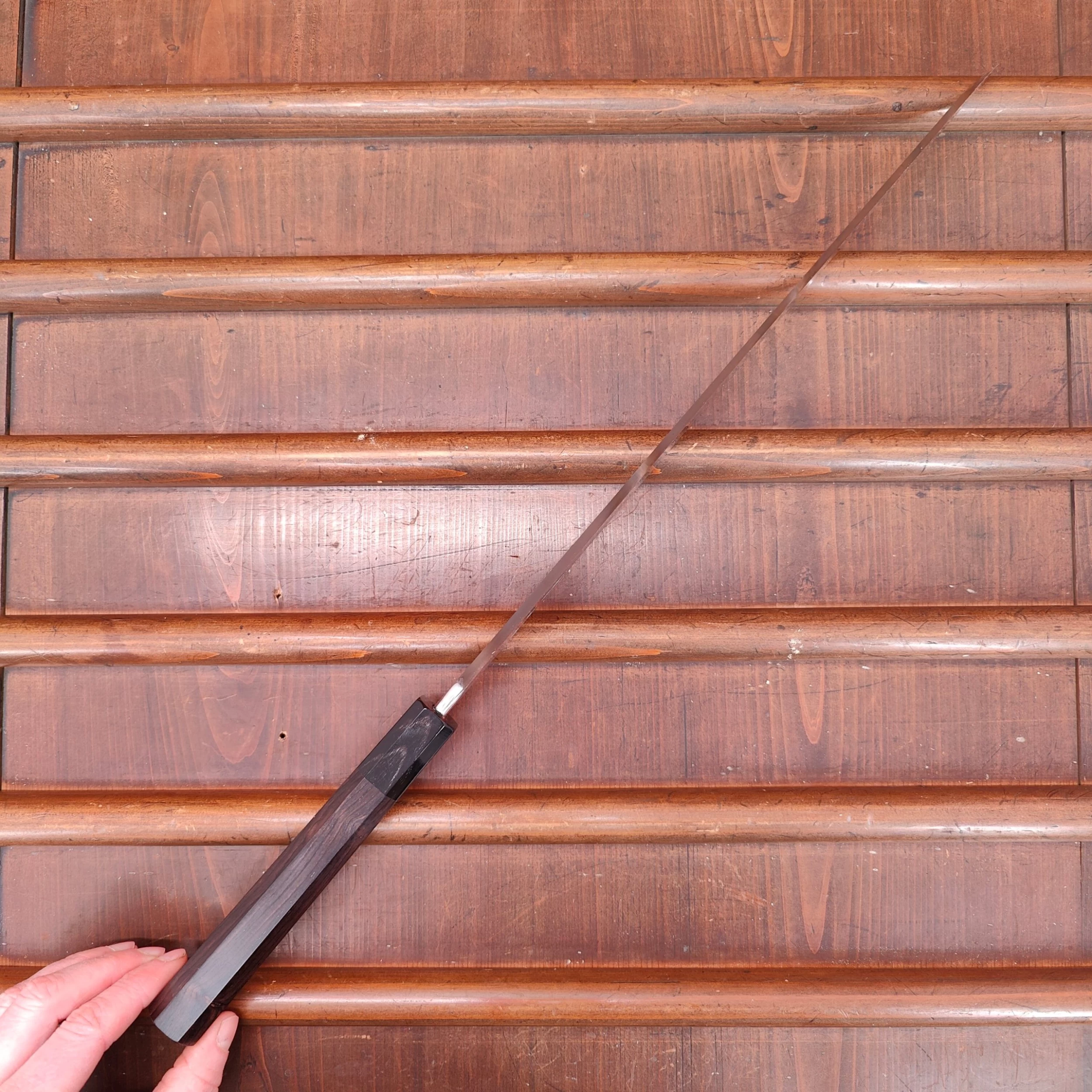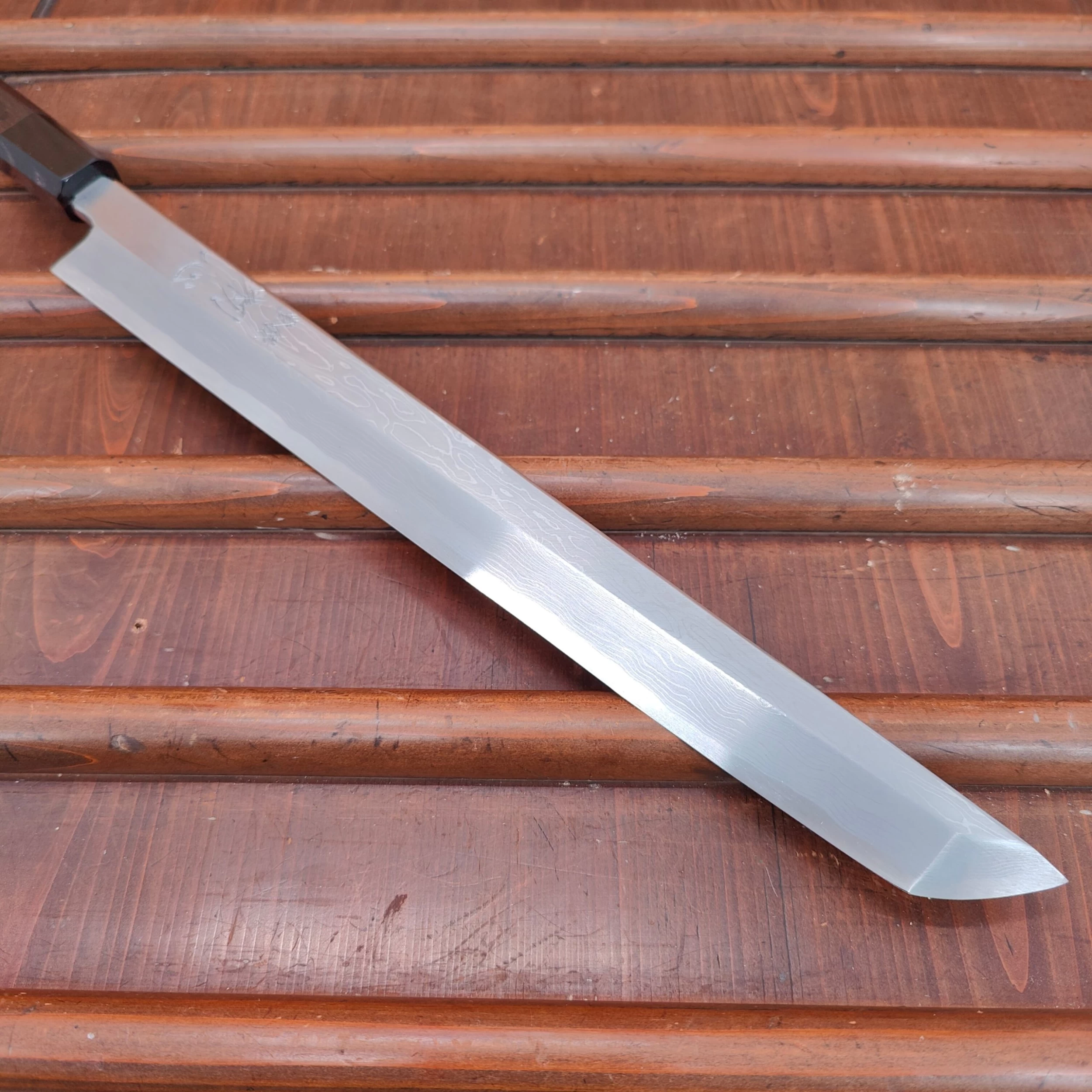Nakagawa-san’s knives are characterized by excellent heat control during forging and a very thorough heat treatment creating knives that have superb edge formation and edge life with good toughness. His carbon steels are usually easy to sharpen across most steel types. Nakagawa-san reputation as one of a few blacksmiths in Sakai to forge Ginsanko and VG10 stainless steels that results in excellent edge life and toughness is well earned.