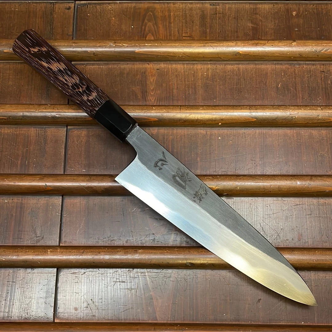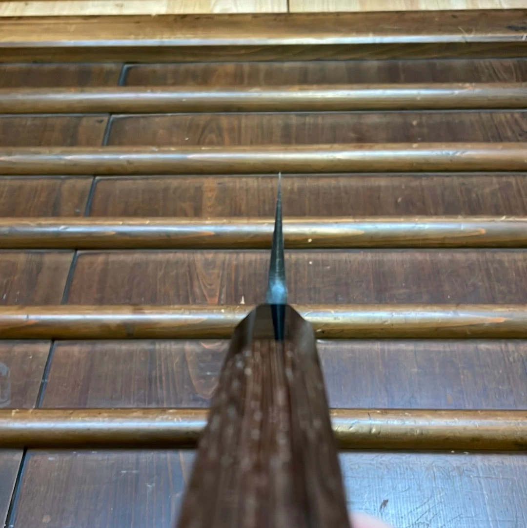 Hatsukokuro Yoake series (dawn) are a hand forged iron clad aogami 1 with a very thick spine that tapers to a fine point. Very tall heels and very thick spines at the neck give these a very big, capable feel.