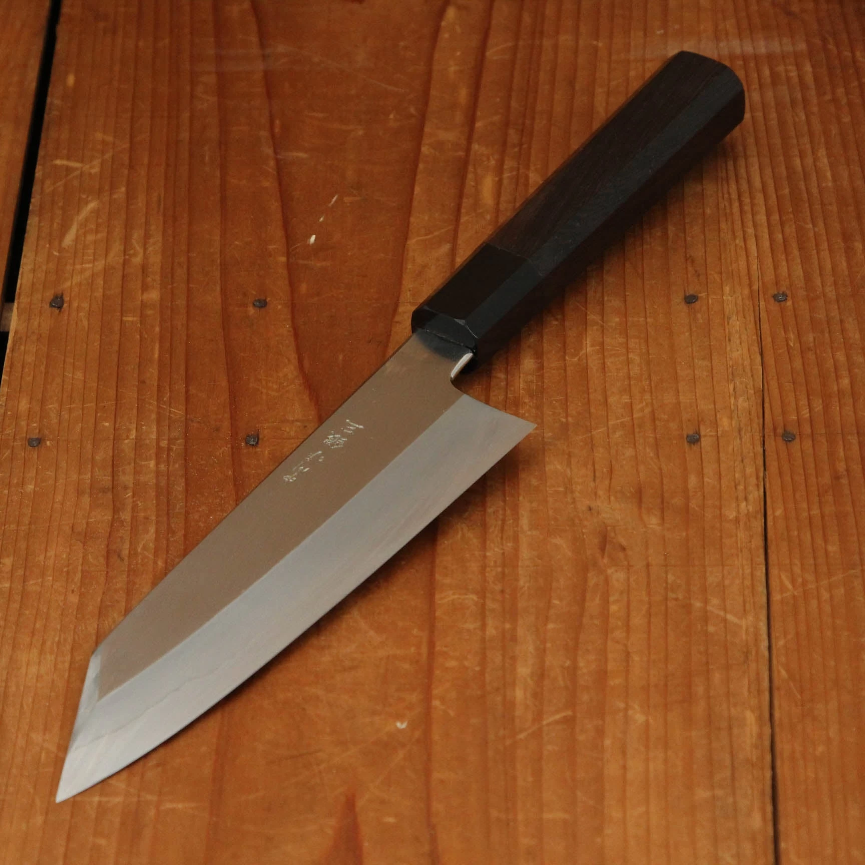 Nakagawa-san’s knives are characterized by superb edge formation and edge life with good toughness. This is due to excellent heat control during forging and a very thorough heat treatment. His carbon steels are easy to sharpen across most steel types. Nakagawa-san is one of only a few blacksmiths in Sakai to forge Ginsanko and VG10 stainless steels. His ginsanko is one of the best we have used and sharpened, with superb edge life, toughness and edge formation.