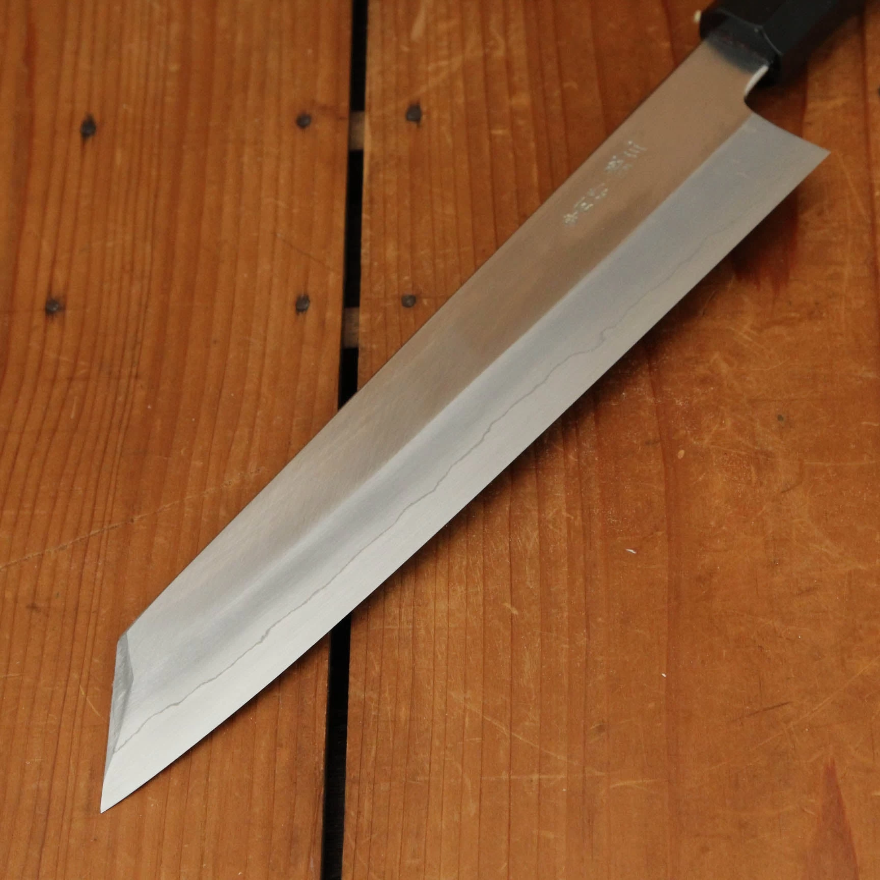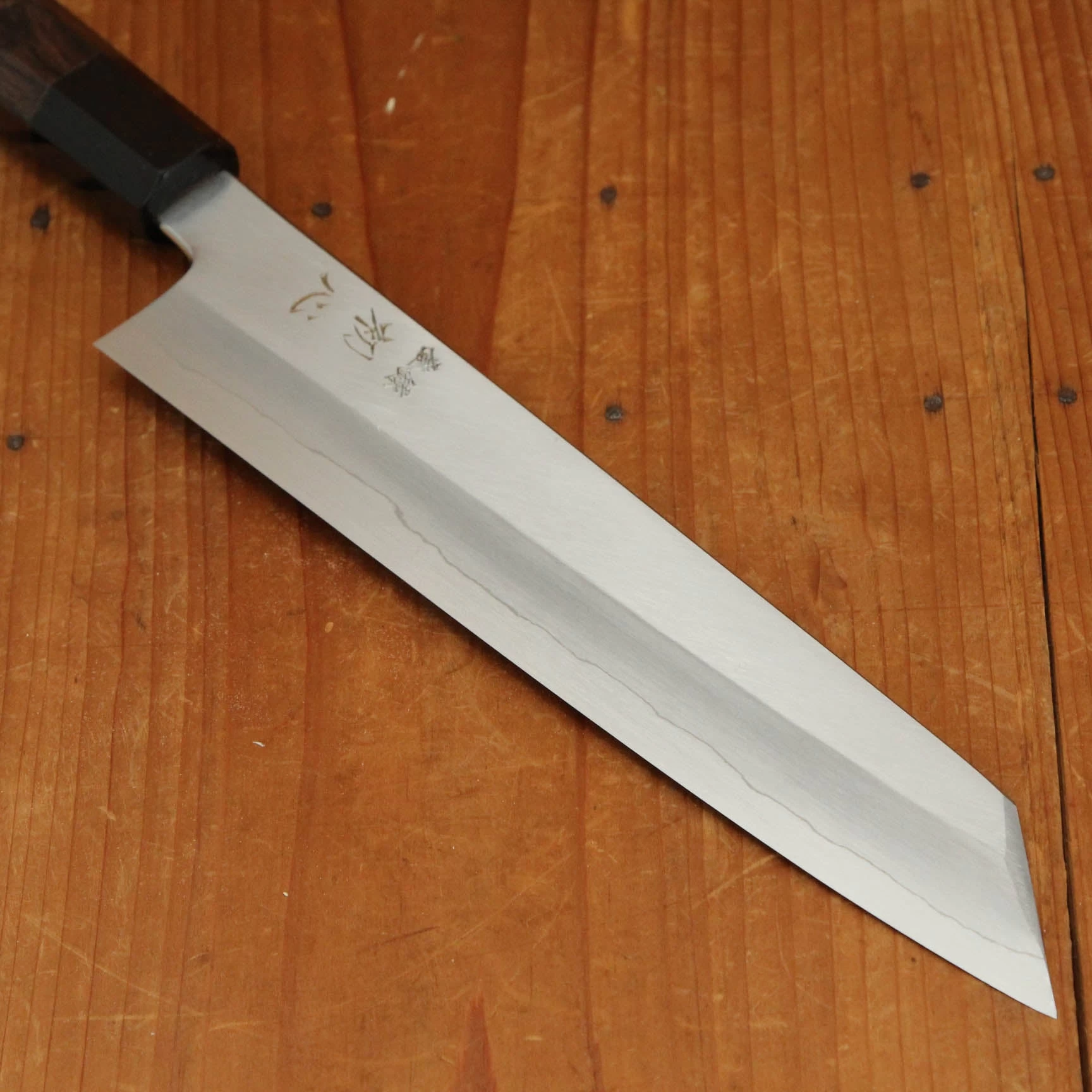 Nakagawa-san’s knives are characterized by excellent heat control during forging and a very thorough heat treatment creating knives that have superb edge formation and edge life with good toughness. His carbon steels are usually easy to sharpen across most steel types. Nakagawa-san reputation as one of a few blacksmiths in Sakai to forge Ginsanko and VG10 stainless steels that results in excellent edge life and toughness is well earned, his ginsanko is one of the best we have used and sharpened, really superb edge life, toughness and edge formation.