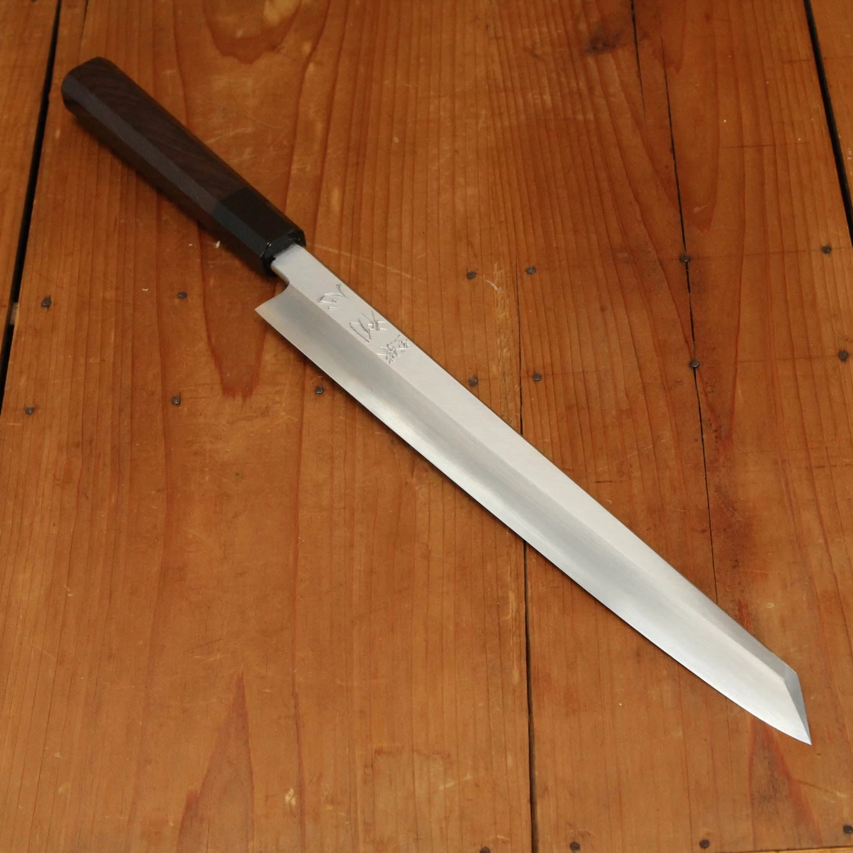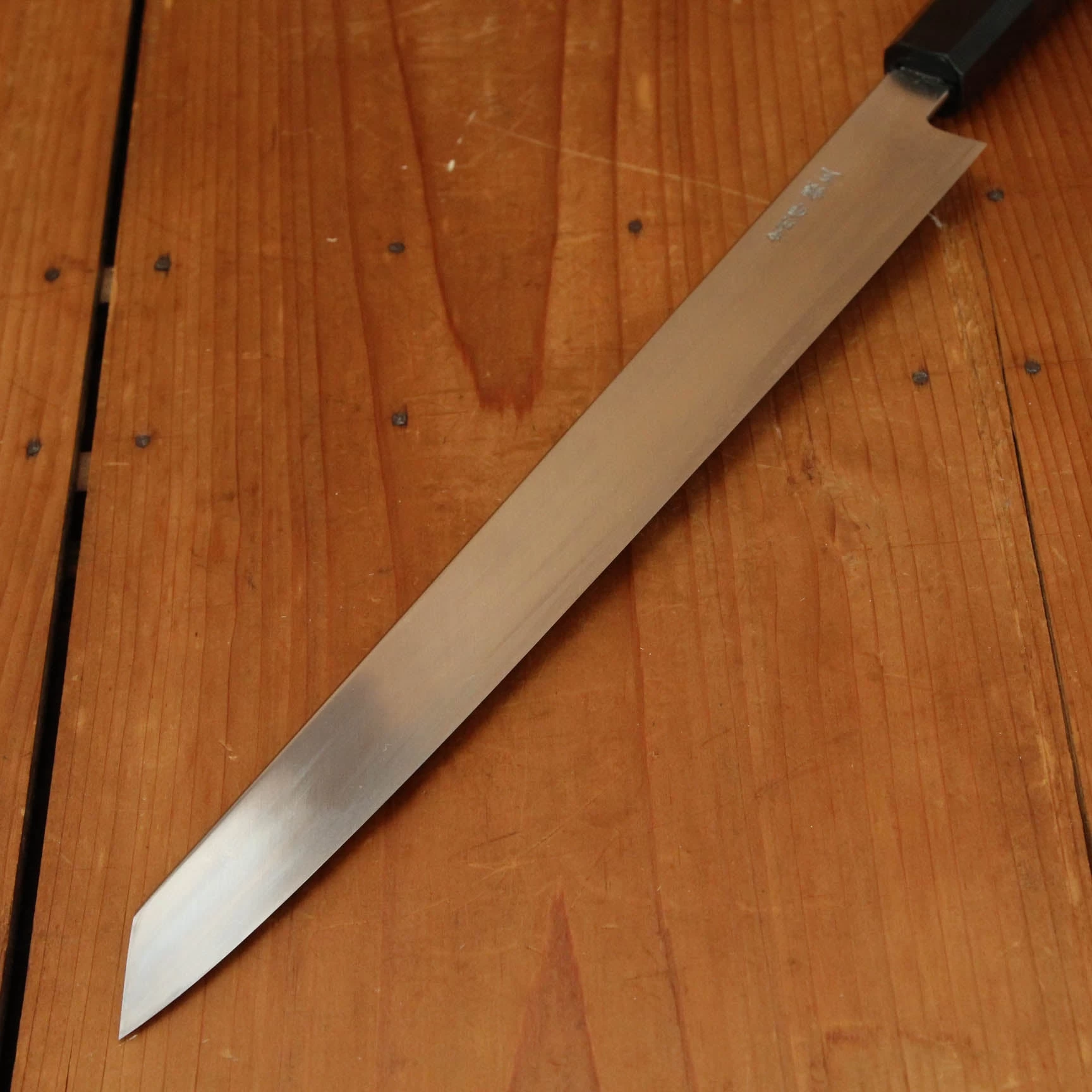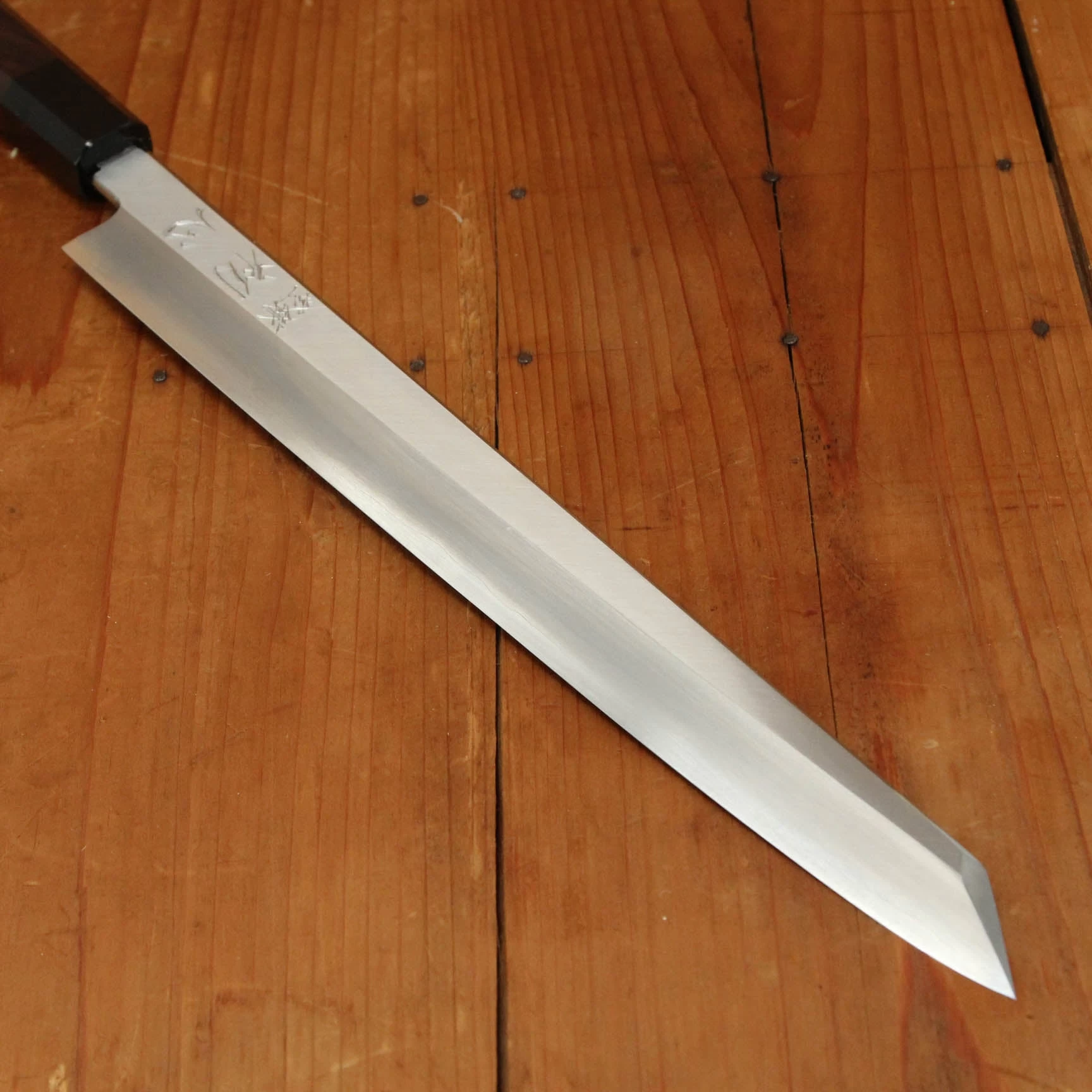 Nakagawa-san’s knives are characterized by excellent heat control during forging and a very thorough heat treatment creating knives that have superb edge formation and edge life with good toughness. His carbon steels are usually easy to sharpen across most steel types. Nakagawa-san reputation as one of a few blacksmiths in Sakai to forge Ginsanko and VG10 stainless steels that results in excellent edge life and toughness is well earned, his ginsanko is one of the best we have used and sharpened, really superb edge life, toughness and edge formation.