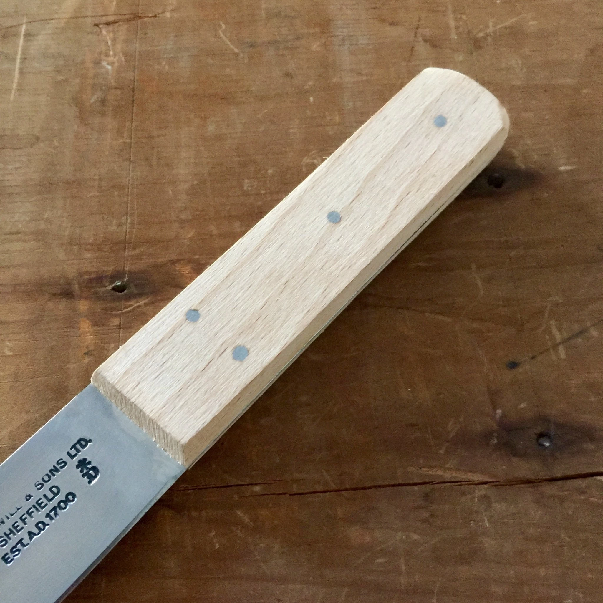 Made in Sheffield England along an old English pattern we were excited to find this style of knife still in production, especially with the old style carbon steel blade and old Nowill stamp. The steel pinned beechwood handle is a staple of Sheffield production that has stood the test of time.