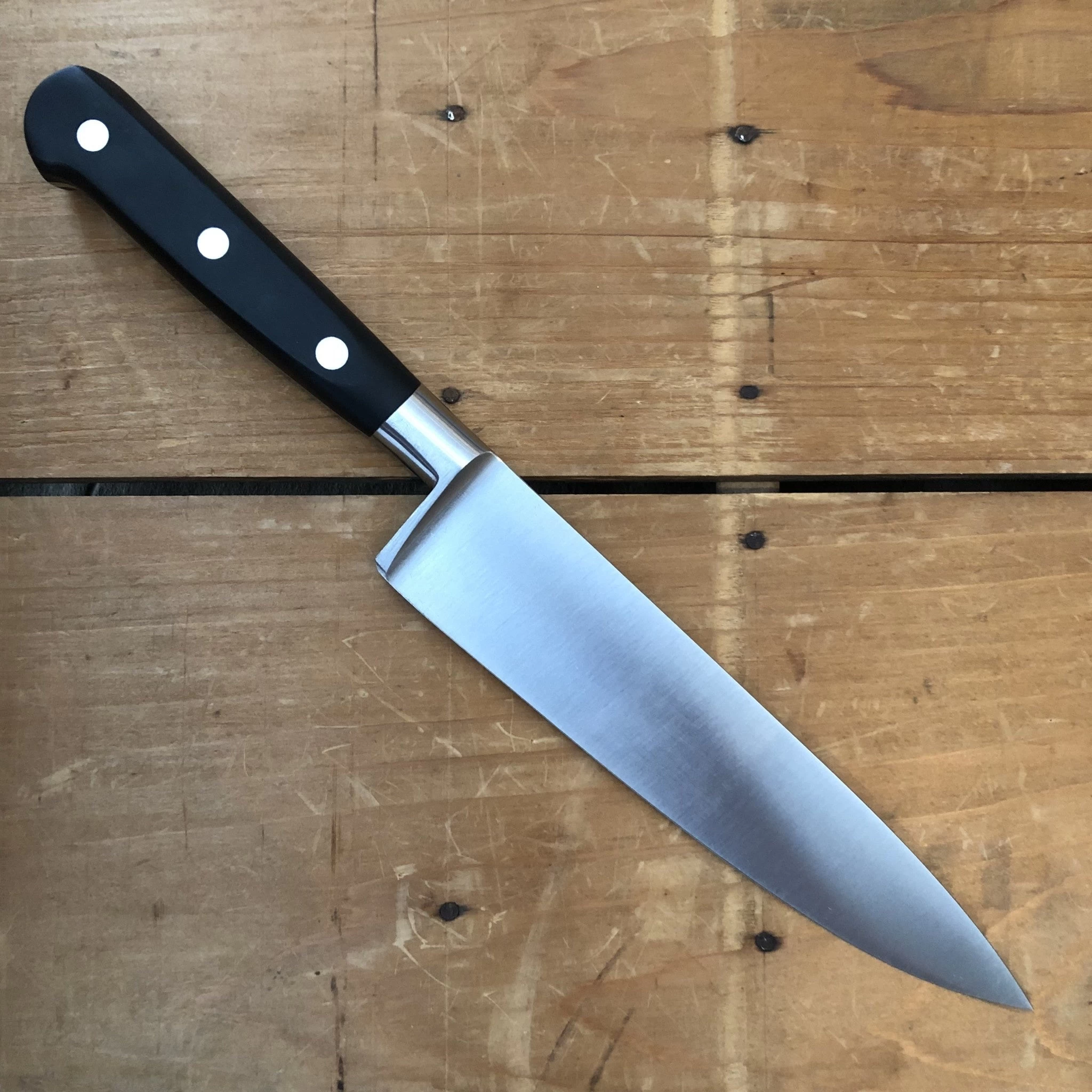 K Sabatier ‘Authentique’ series 6′ chef knife. Stainless steel blade with riveted black POM handle.