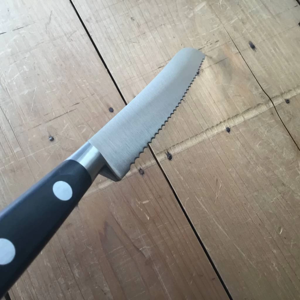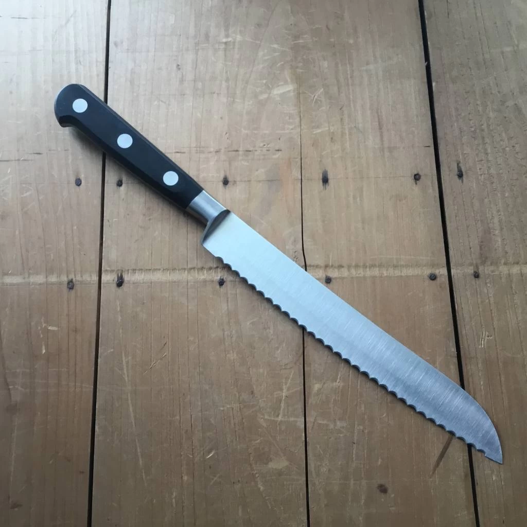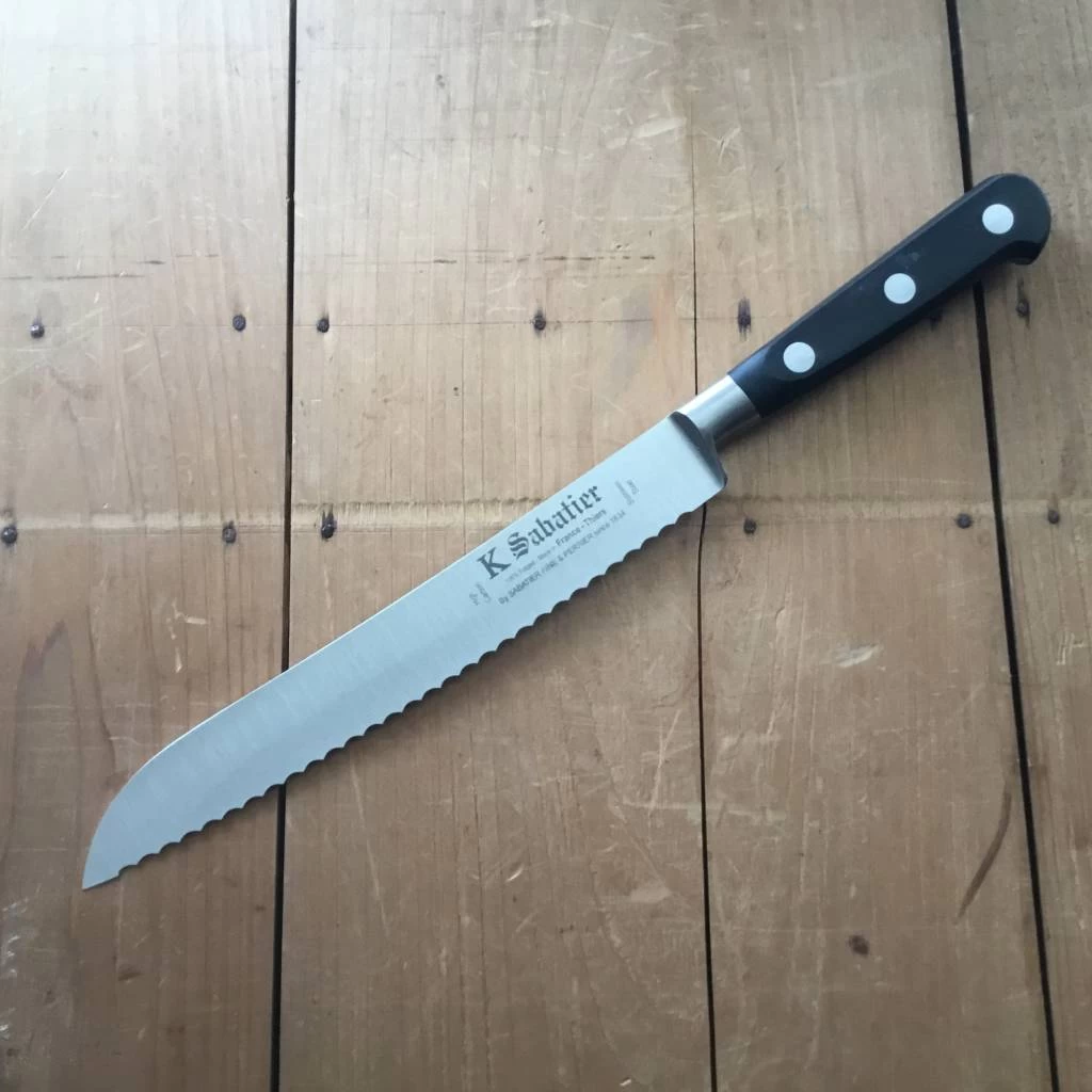 K Sabatier ‘Authentique’ series 8″ serrated bread knife. Stainless steel blade with riveted black POM handle.