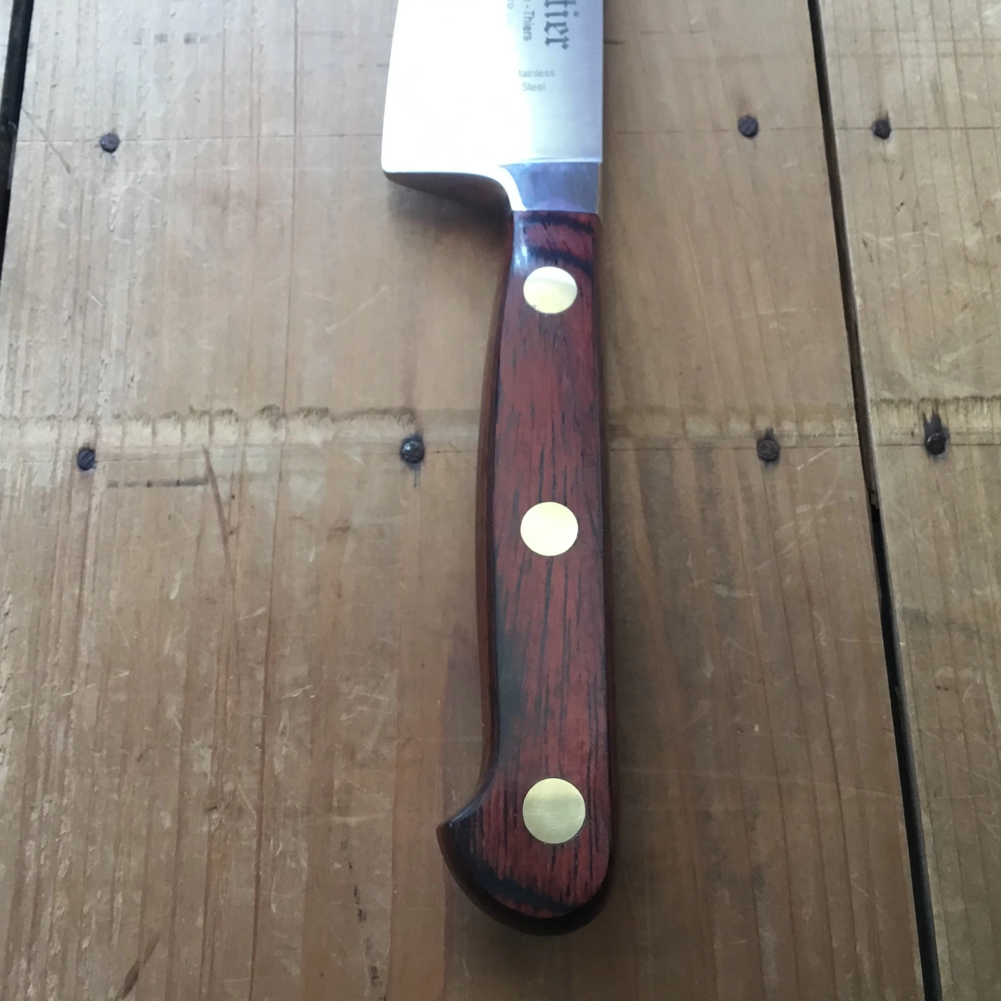 K Sabatier ‘Auvergne’ series 6″ chef knife. Forged stainless steel with red pakka wood handle and brass rivets.