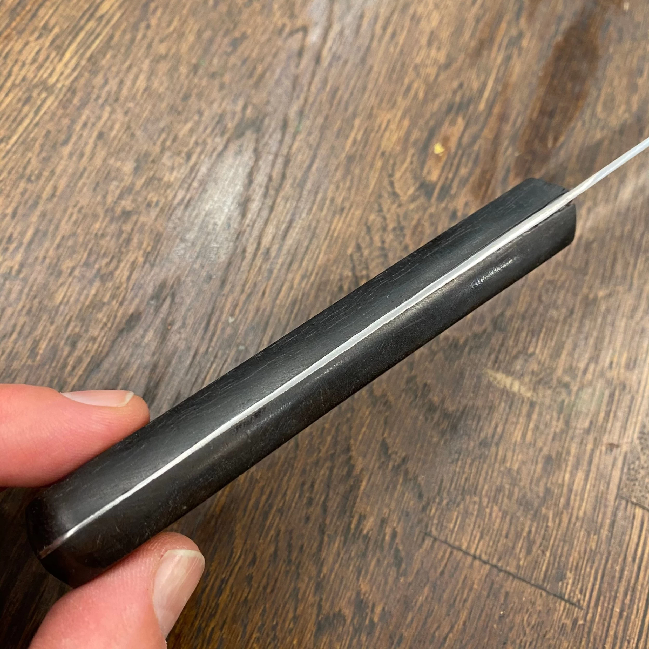 These ‘Plate-Semelle’ or ‘flat plate’ knives were made in Theirs, France, in the 1950s. These were the working-class knives of their day. They lived for action in the back kitchen, or ‘office’, where game would be processed in large homes. They also served as work knives in more humble homes.