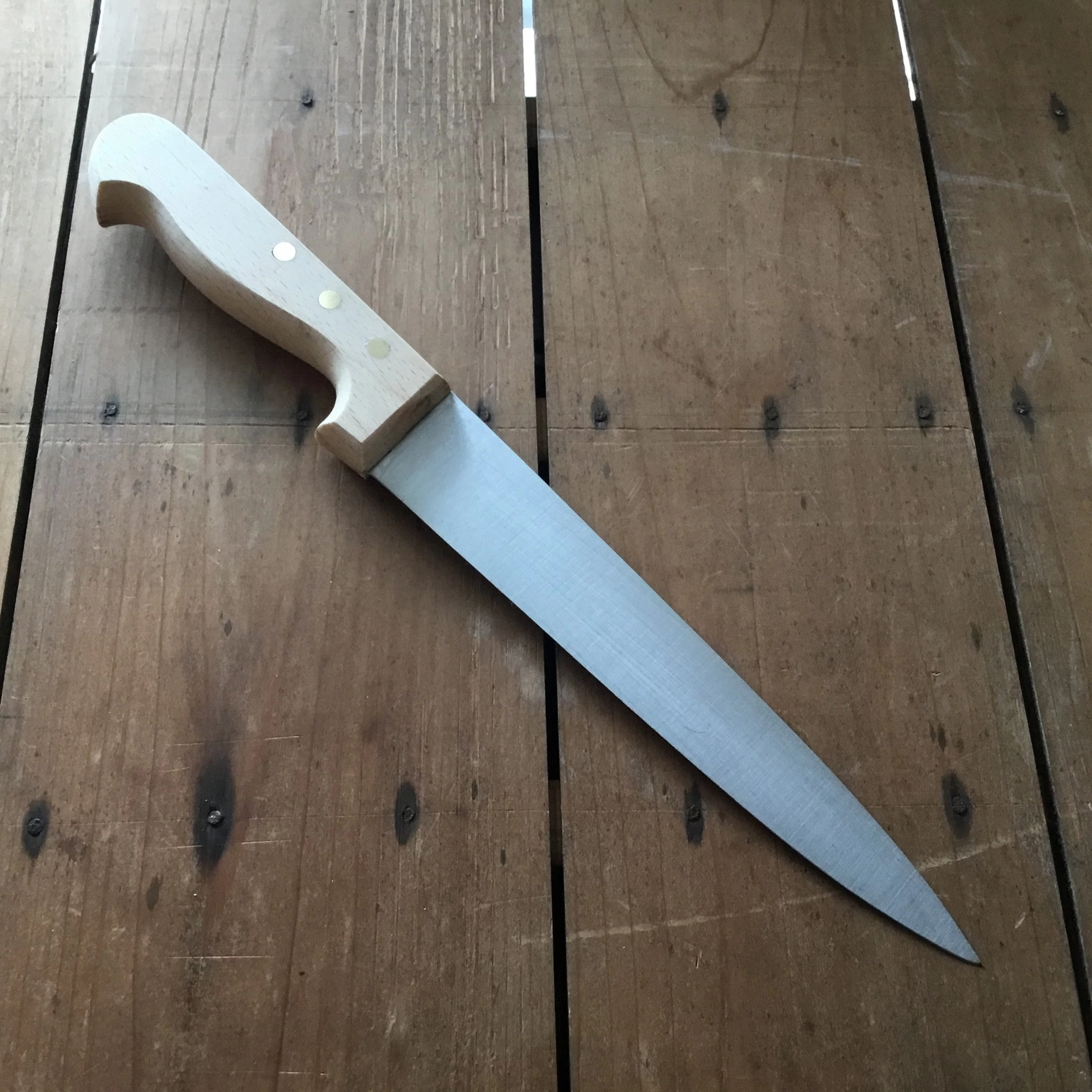 K Sabatier 8″ Saigner’ butcher knife with stiff triangular carbon steel blade and beech wood handle. Keep dry when not in use to avoid rust. No Dishwasher.