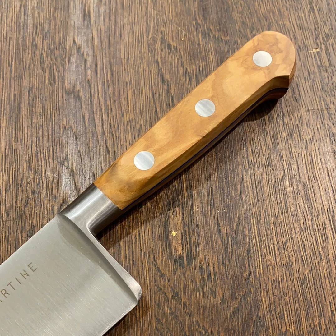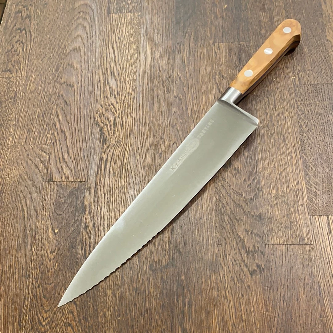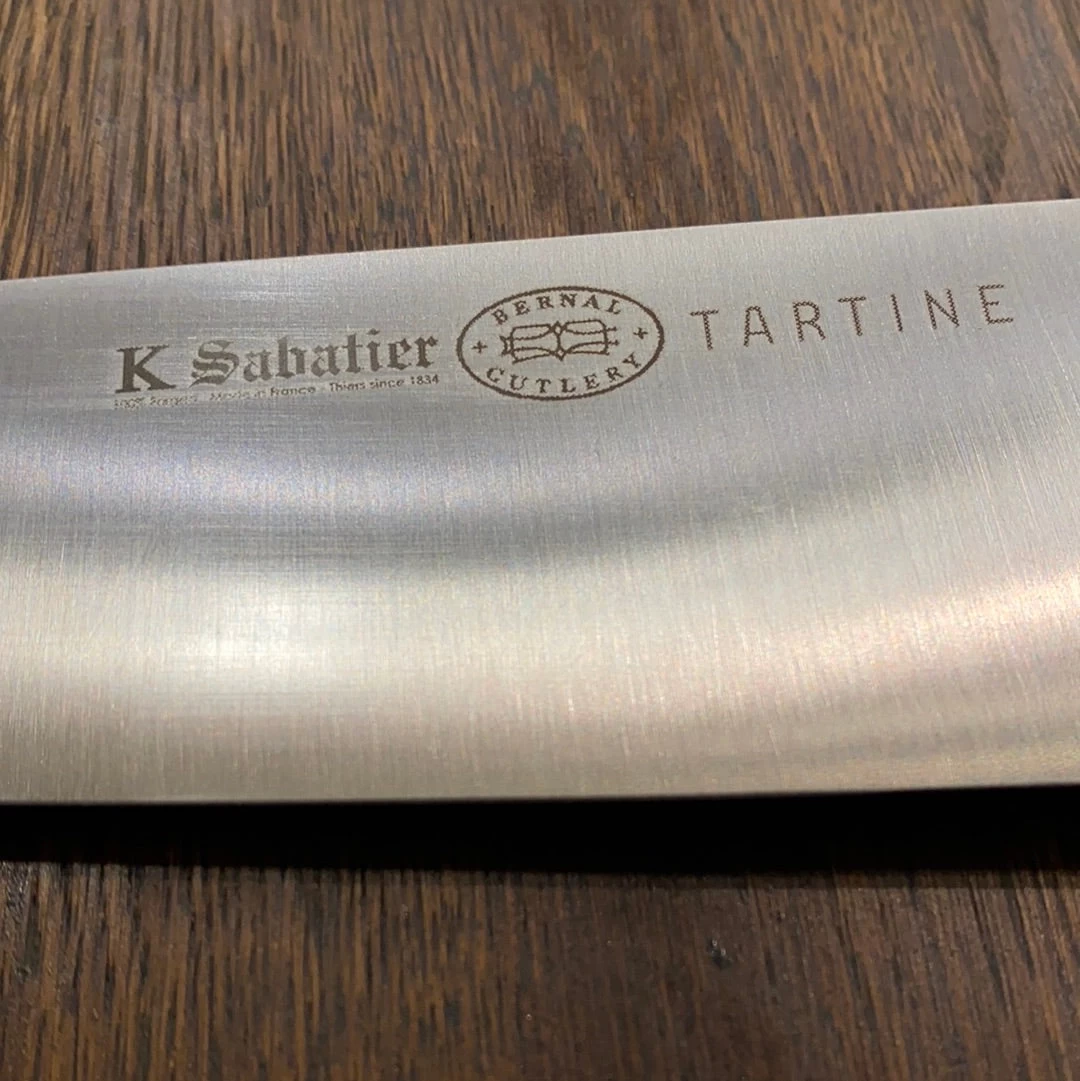 The idea for the Tartine – K Sabatier – Bernal Cutlery collaborative bread knives was sparked during a conversation between Tartine’s Chad Robertson and Bernal Cutlery’s team. Chad confessed that he prefers to use a chef knife to cut bread (especially the big sourdough loaves that Tartine is famous for) but sometimes wished the knife was more aggressive at the tip. We all agreed on trying to combine the great cutting ability of carbon steel and the merits of the old standby of the bread knife phylum; the serrated knife. With this in mind, the possibility was discussed with Philippe Bournilhas of K Sabatier. Philippe was excited and came up with a new take on the solid olive wood handles that are a Bernal Cutlery favorite, adding blue and red spacers as an homage to the colors of France and USA. From these conversations, our two collaborative bread knives were born, a 10″ carbon steel chef knife with a serrated tip, and a 12″ stainless steel serrated slicer.