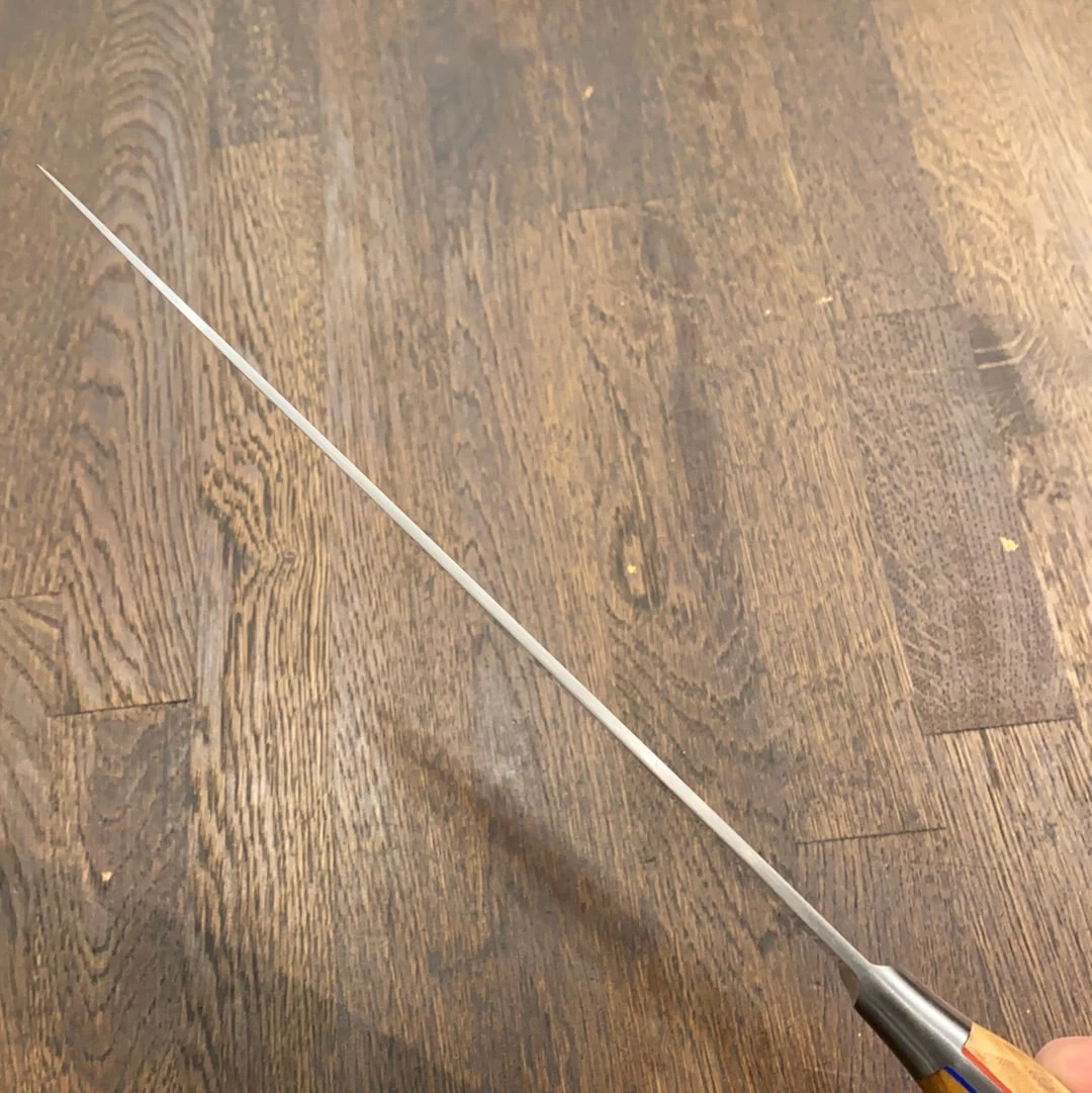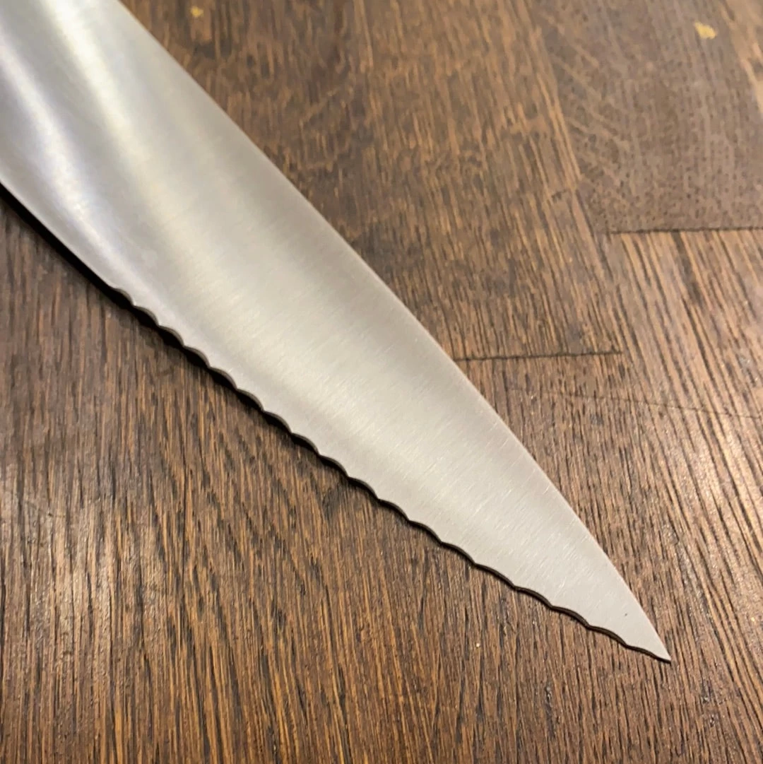 While there are other serrated-tip chef knives, we wanted one in French carbon steel, with superior toughness and edge life to the stainless. Most likely, folks will find this an all-around workhorse in their kitchen, not just for Tartine bread! We decided on a stainless 12″ round tip slicer shape for the partner, as some folks will undoubtedly prefer a more traditional style bread knife with less maintenance needed.