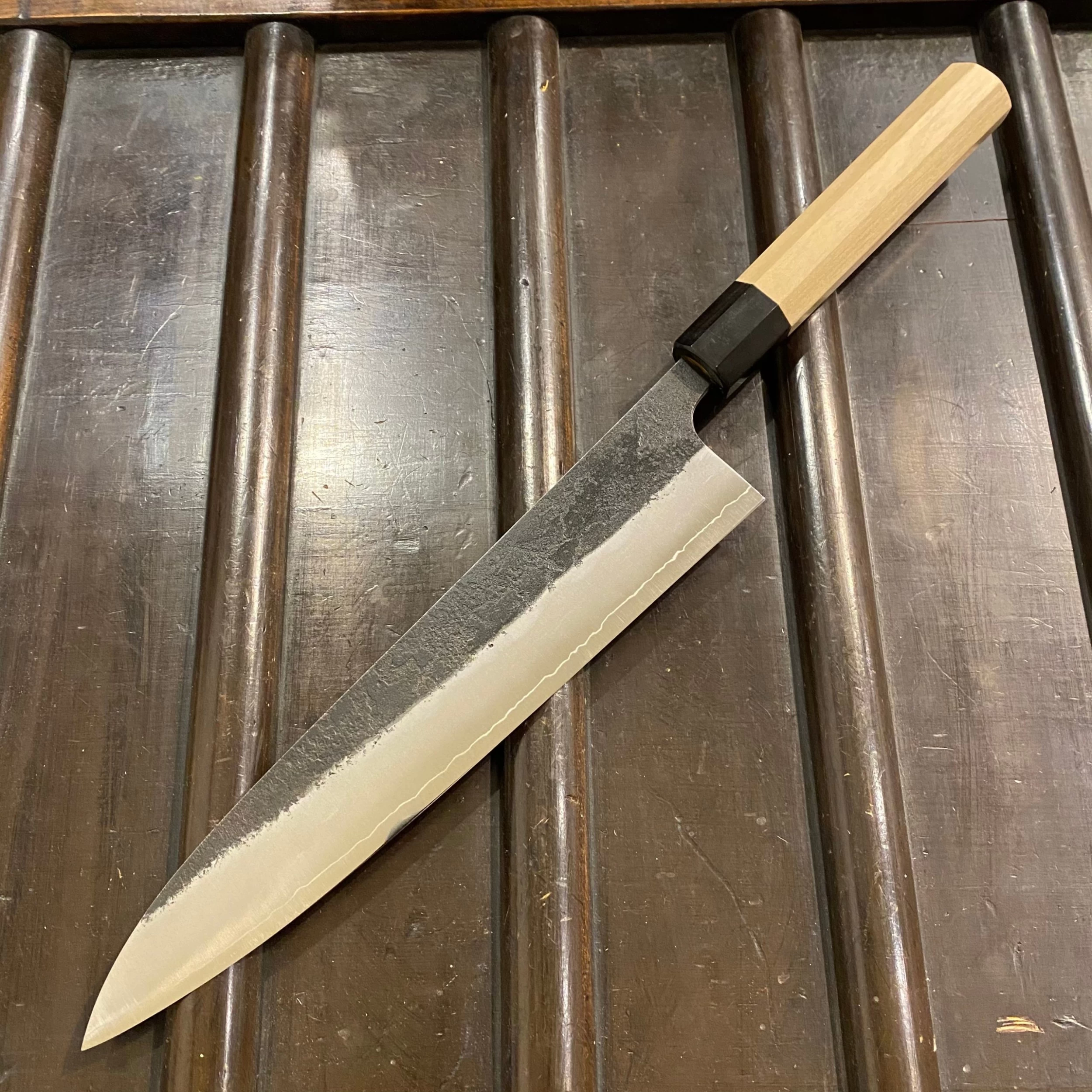 Hand forged and hand ground in Fukushima for Konosuke by Takahiro Nihei. Excellent forging, heat treatment and finish with a classic robust feel. Comes with Saya.
