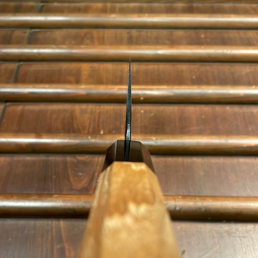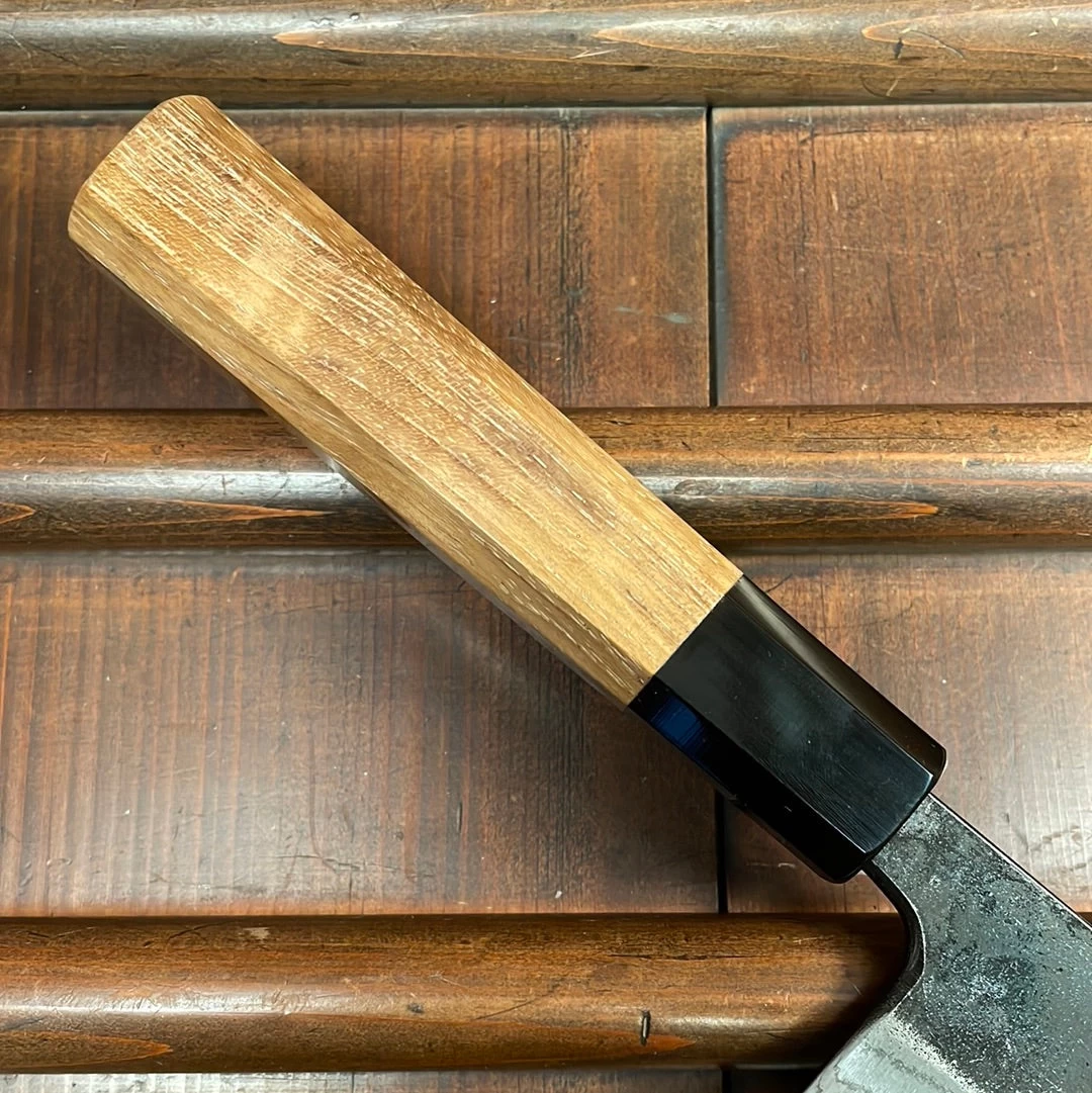 Hand forged in Tosa, these rustic finished mild steel and iron damascus clad aogami 2 knives have a solid middle to heavy weight feel yet are thin behind the edge. Corners of the spine and heel are eased, making for a more comfortable pinch grip with a horn and teak handle for a solid, secure feel.
