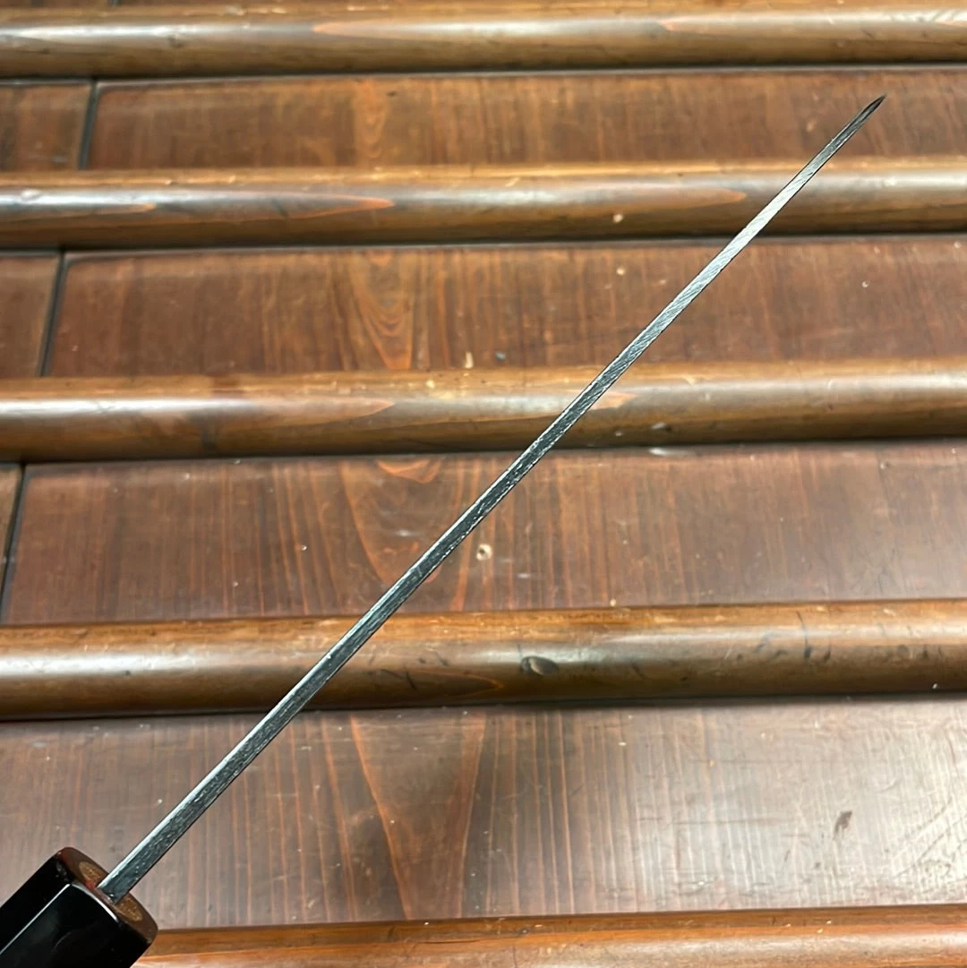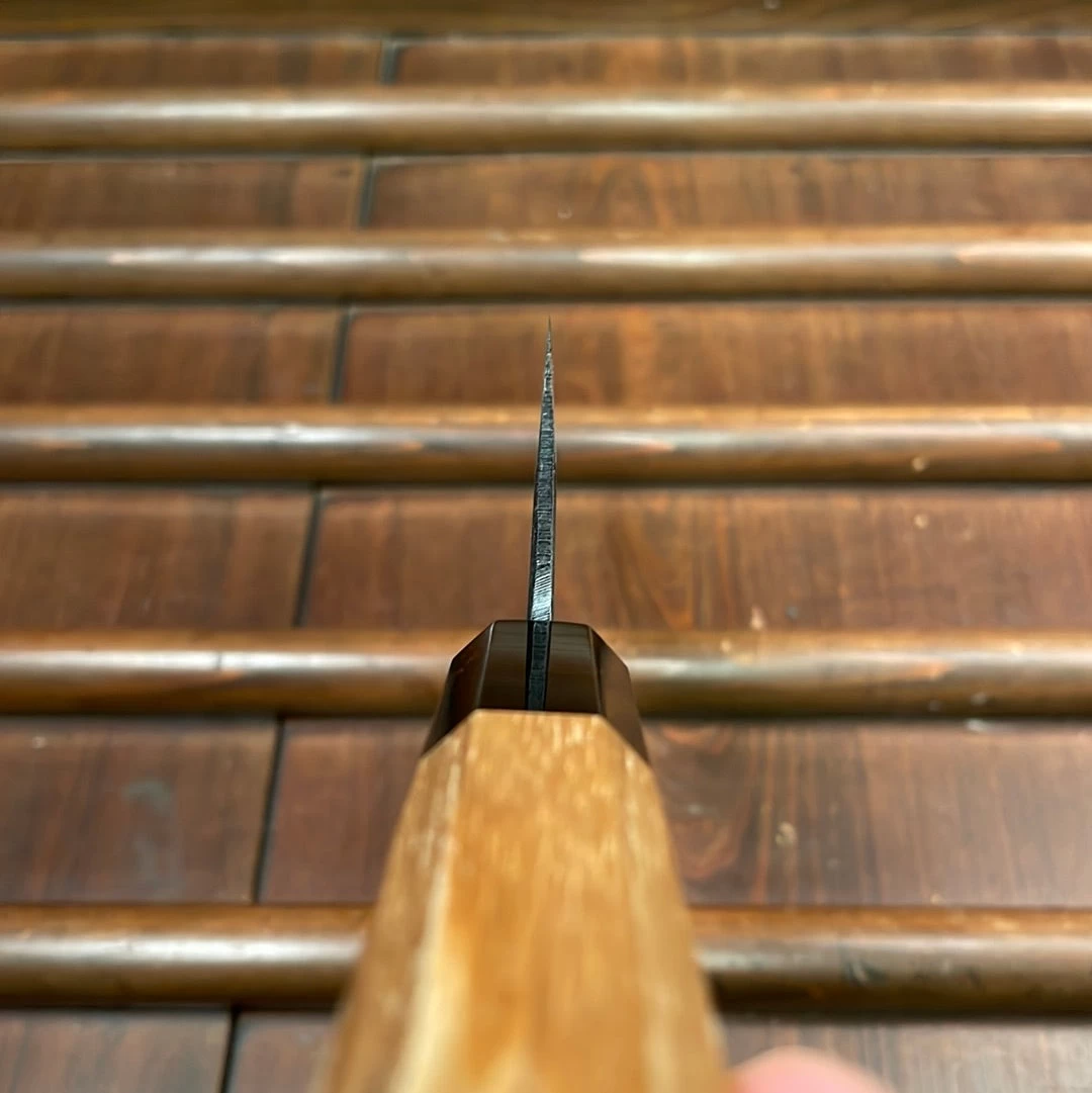 Hand forged in Tosa, these rustic finished mild steel and iron damascus clad aogami 2 knives have a solid middle to heavy weight feel yet are thin behind the edge. Corners of the spine and heel are eased, making for a more comfortable pinch grip with a horn and teak handle for a solid, secure feel.