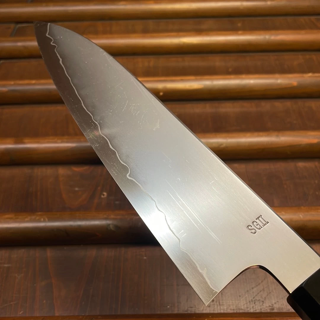 SG2 is a very fine grained stainless steel that is capable of working well at very fine finishes and is known for holding it’s peak sharpness for a good length of time. It must be noted these are ground very fine and will not tolerate rough use, no bones or twisting on cutting boards.