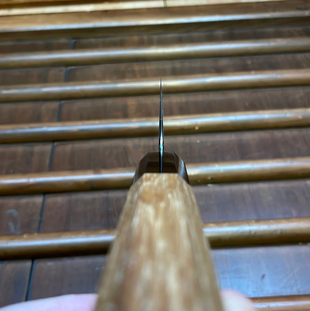 Naohito-san became known to us here from his fabulous grinds and finishes on the Konosuke Fujiyama FM knives. We have been consistently impressed with how nicely these fine blades cut and at the quality of his finish work. It is exciting to get more knives finished by this young but very talented sharpener and now blacksmith as Naohito-san has begun to forge some of his own knives.
