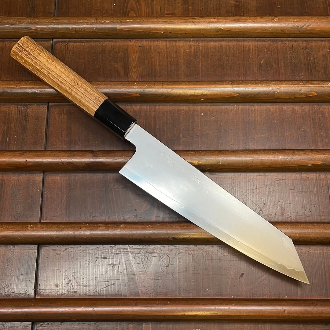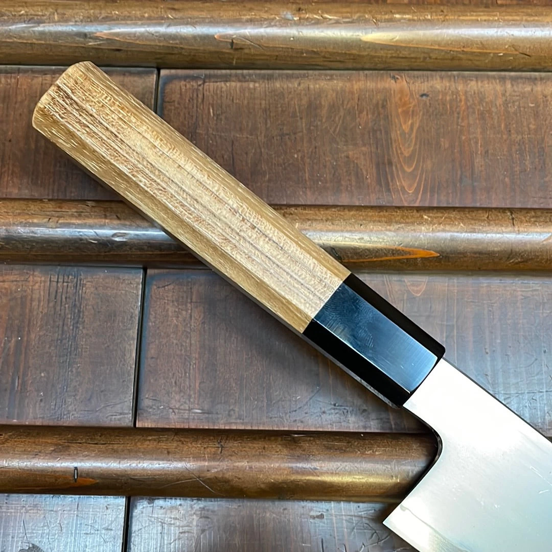 Naohito-san became known to us here from his fabulous grinds and finishes on the Konosuke Fujiyama FM knives. We have been consistently impressed with how nicely these fine blades cut and at the quality of his finish work. It is exciting to get more knives finished by this young but very talented sharpener and now blacksmith as Naohito-san has begun to forge some of his own knives.