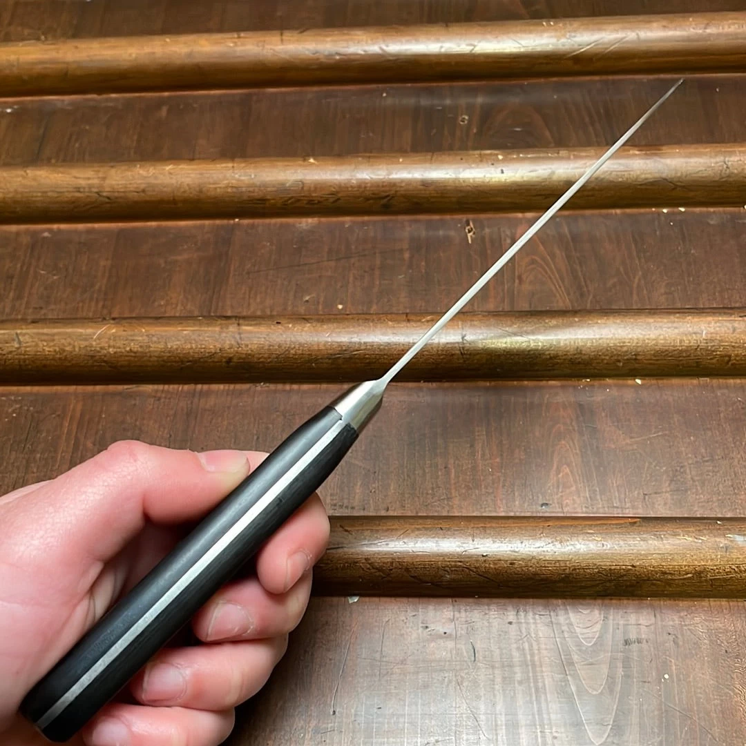 New production classic old style Japanese double bevel knife with a monosteel SK tool steel blade and riveted pakka wood western style handle. Their thin SK mono-steel blades cut very nicely and are super easy to sharpen and get a nice edge that holds well. They are ideal for the professional or home cook who is looking for a carbon steel workhorse with easy sharpen-ability at a reasonable price.