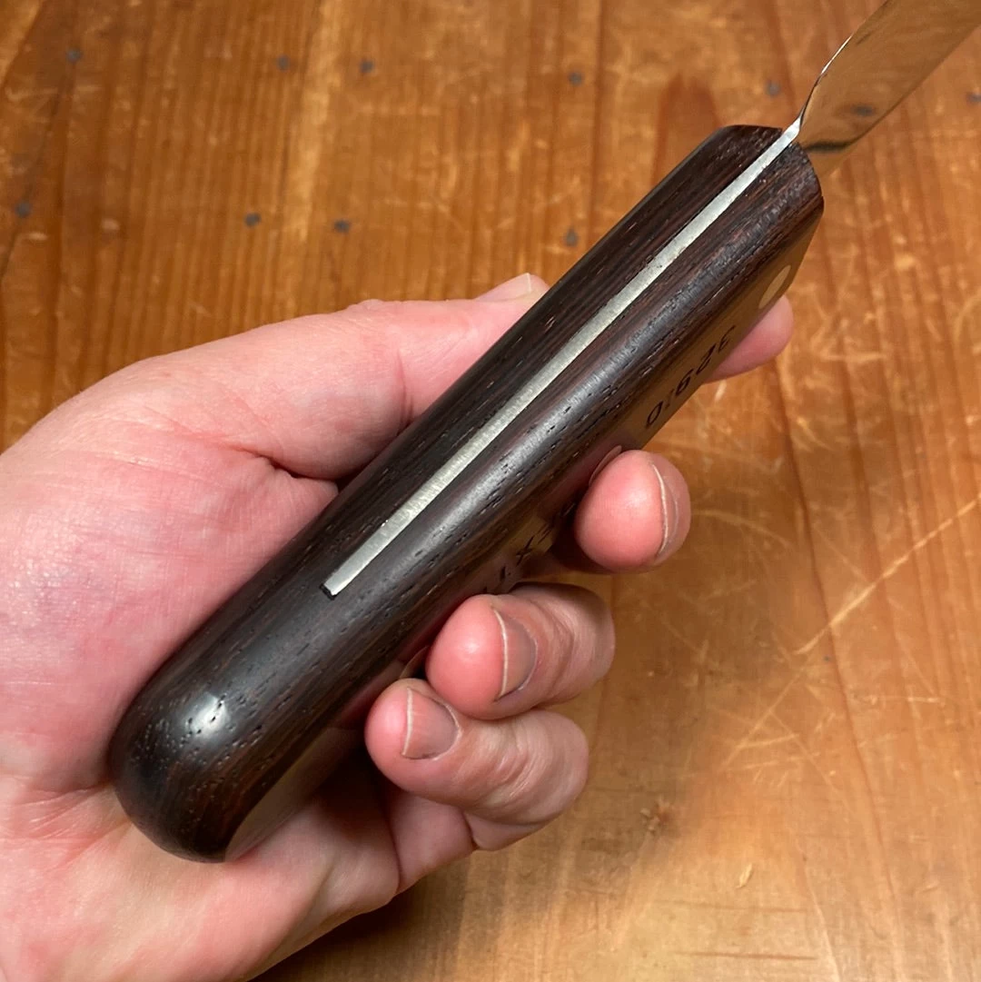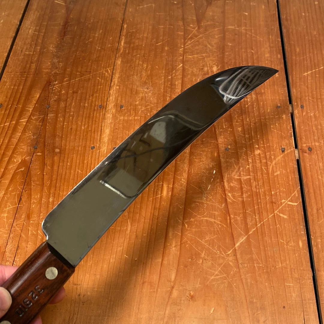 Unused Dexter hand ground carbon steel mirror finished carbon steel and rosewood 10″ scimitar from the 1950’s to 70’s.