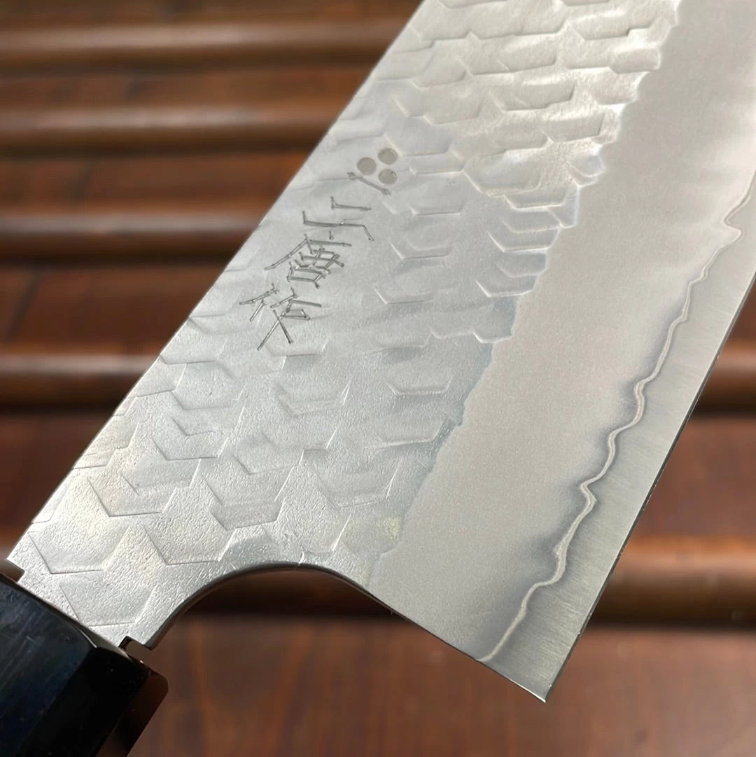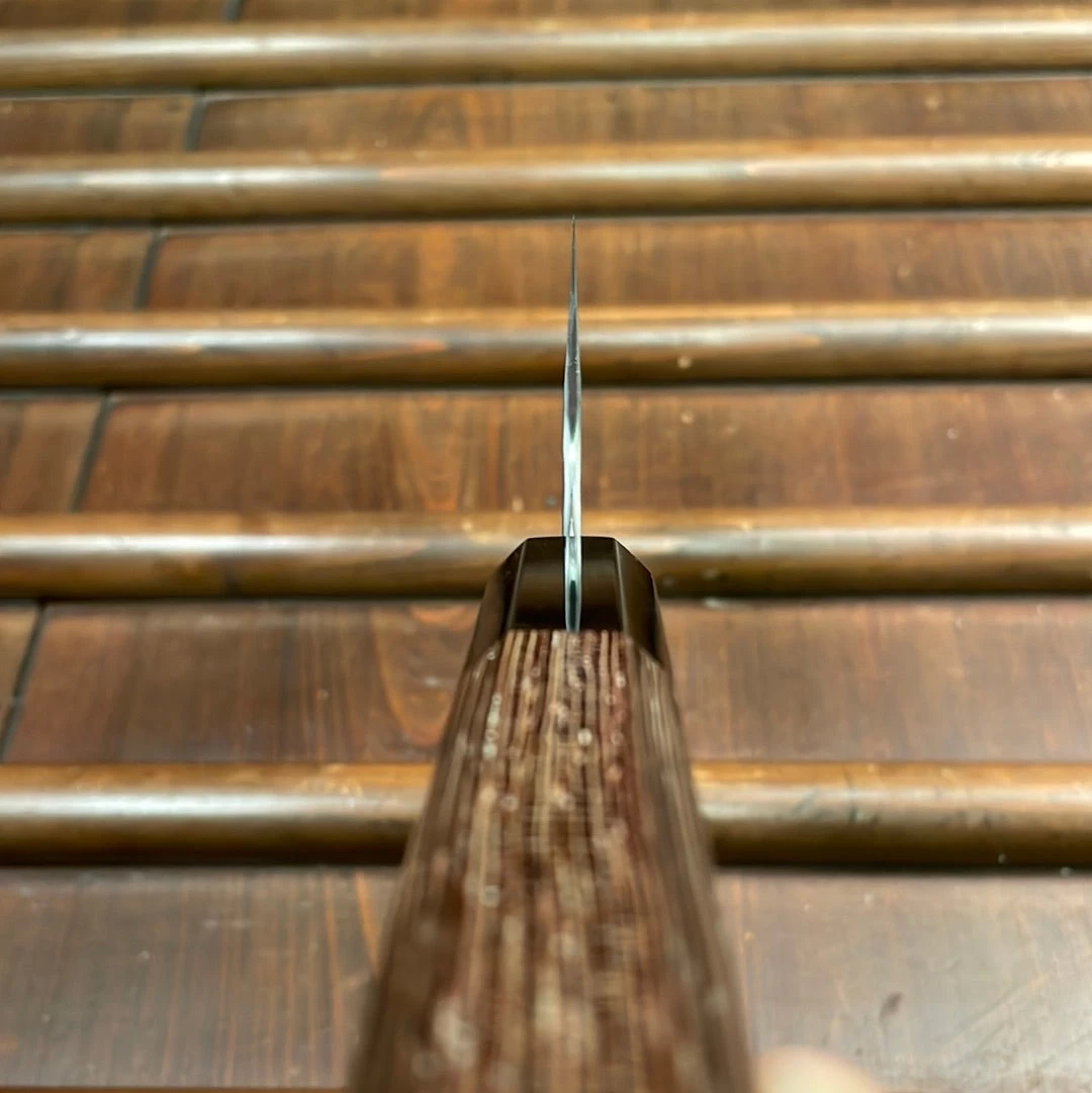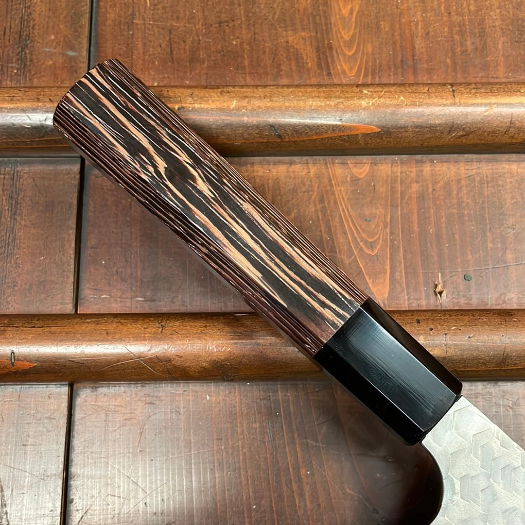Forged stainless clad SG2 powder metal with hammer marked tsuchime cladding and octagonal wenge handle. SG2 takes a very fine edge easily for a stainless steel of its hardness (63/64) and holds it nicely.
