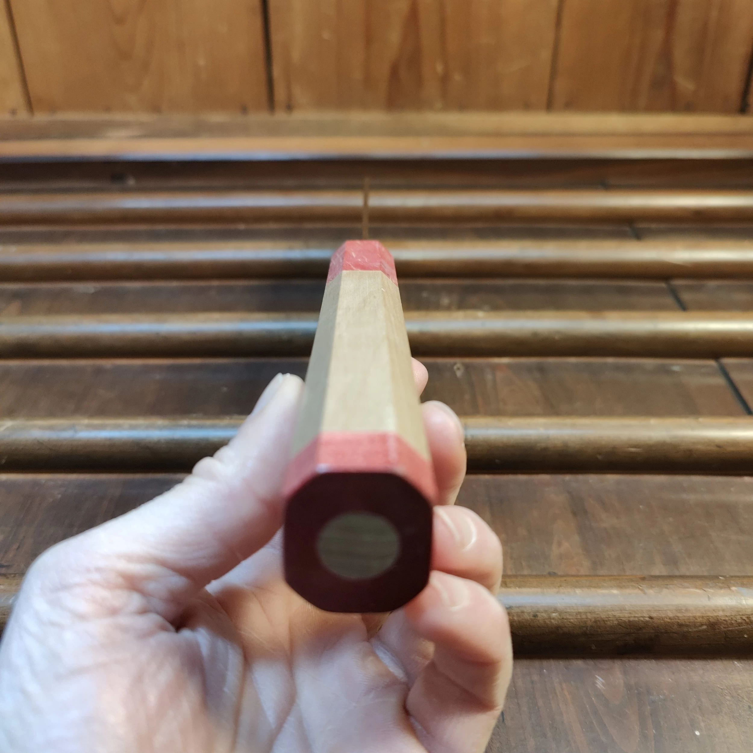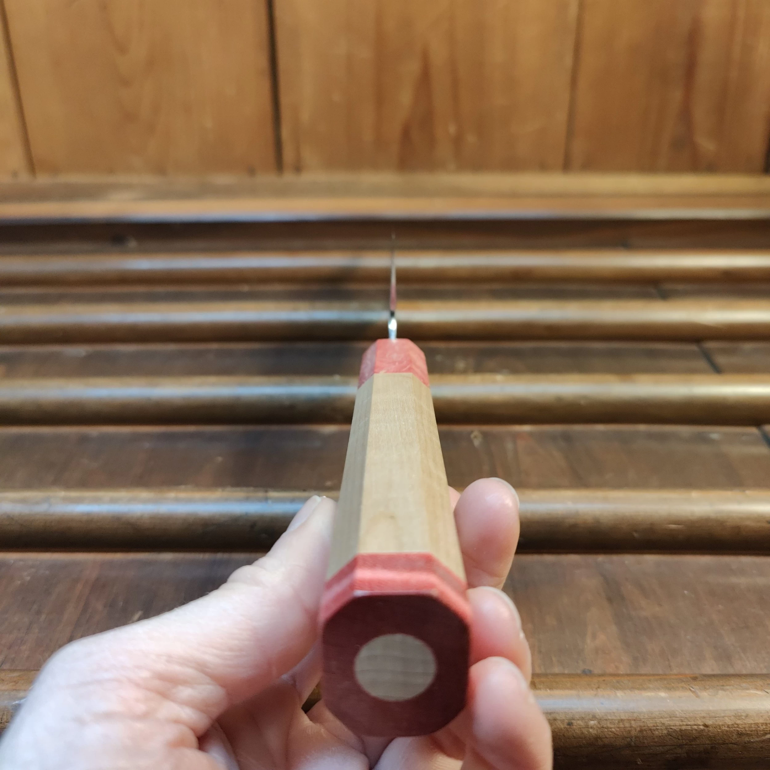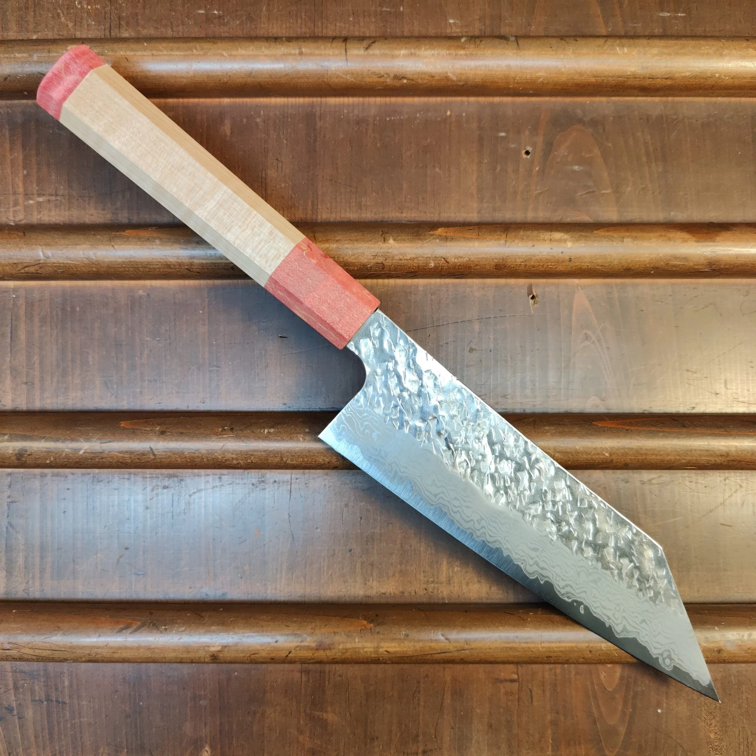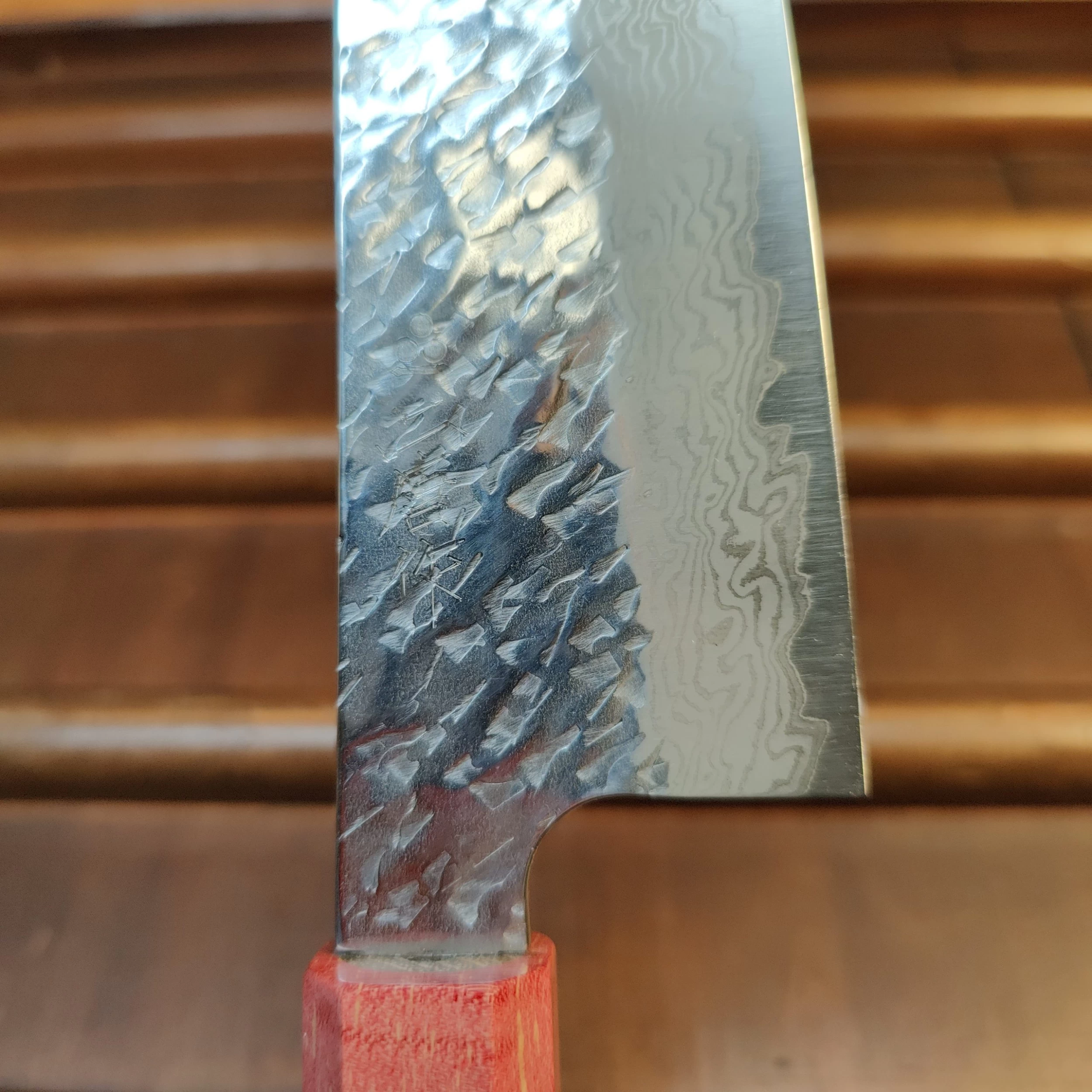 VG10 Japanese stainless steel clad with tsuchime suminagashi (hammer marked damascus) cladding and octagonal maple handle with red maple bolsters. VG10 is a well rounded Japanese stainless steel specifically made for cutlery, it has a good blend of edgelife, toughness and good stainless properties.